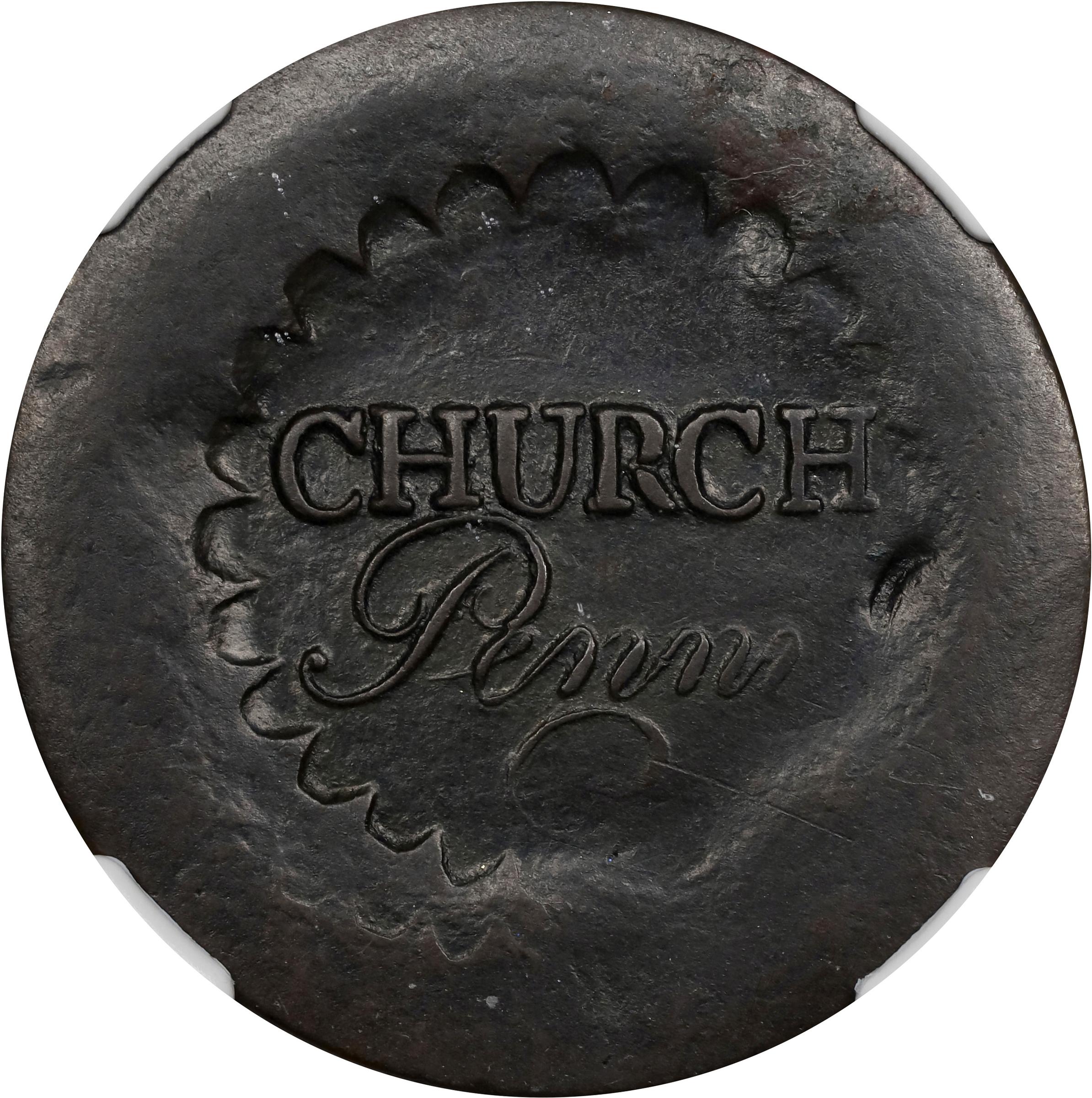 - 100.2 grains. An intriguing example of this rare type, and a unrivalled condition rarity whose NGC grade of AU-58 BN confirms it as the single finest certified Albany Church Penny of either variety. Apparently, a 19th century Canadian has been lightly struck over the reverse of the Church penny. It shows a shield inscribed A. MONGEAU / BIJOUTIER & / HORLOGER / MONTREAL, above which is a small device, below which is a wreath. The depth of the incuse design on the obverse of the Church penny preserved it nicely, with the word CHURCH bold, PENNY also complete save for the middle of the long flourish of the letter Y. As well, the serrated border surrounding CHURCH / PENNY is bold except at the lower right, where it is obscured along with the flourish of the Y. Both sides are evenly toned in pleasing dark copper brown, the surfaces remaining pleasingly smooth even when scrutinized with the aid of a loupe. A minor flaw along the inside right edge of the serrated border, just below the letter H in CHURCH, is as made and hardly of concern.<p>The Albany Church pennies are attributed to the First Presbyterian Church of Albany, New York and were produced as a result of a resolution passed by the church elders on January 4, 1790. These pieces were intended to provide parishioners with coppers to place in the Sunday offering plates, this at a time when small change was extremely scarce in the area following the coppers panic of 1789. The resolution authorizing these coins is quoted in Q. David Bowers' 2020 <em>Whitman Encyclopedia of Colonial and Early American Coins</em>:<p><em>Resolved: That one thousand coppers be stamped Church Penny, and placed with the treasurer to exchange with members of the congregation, at the rate of twelve for one shilling, in order to add respect to the weekly collections.</em><p><em></em>Two varieties were produced, one without a letter D added to the field above the word CHURCH, as here, and the other with a D added. This letter is thought to be an abbreviation for penny, or denarium, as it was known in the English monetary system. Long assumed to be of about the same rarity, it actually looks like the With D variety is the rarer of the two by a significant margin. With probably only a dozen or slightly more known, of course, the Without D variety offered here is a major numismatic rarity in its own right. This is a well known specimen, Richard Picker's example of the Without D variety (he also had a With D example), and with the overstrike on the reverse it is unique. Representing a fleeting opportunity for the advanced collector of early American coinage, this offering will surely garner much attention and result in spirited bidding.