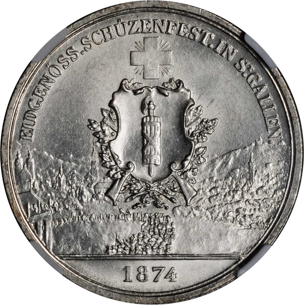 - SWITZERLAND. St. Gallen. 5 Francs, 1874. NGC MS-64.