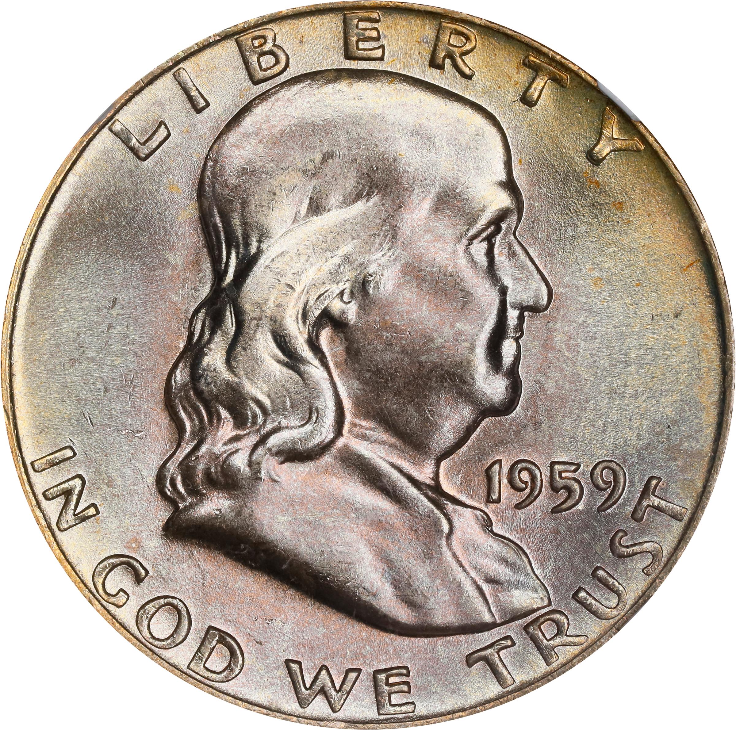 - This is a virtually pristine example with charming silver-lilac toning that yields to blushes of champagne-gold here and there at the borders. Highly lustrous with a silky smooth appearance, razor sharp striking detail is also a praiseworthy attribute. The 1959 has a generous mintage of 6,200,000 circulation strike, survivors of which are nonetheless elusive in grades above the MS-65 level, with or without an FBL designation. In the latter category, and at the Superb Gem level of preservation, the 1959 is "Extremely rare," as described by Franklin half dollar specialist Rick Tomaska (2023). One of the finest examples of the issue that we can recall offering, this phenomenal condition rarity is sure to sell for a strong premium.