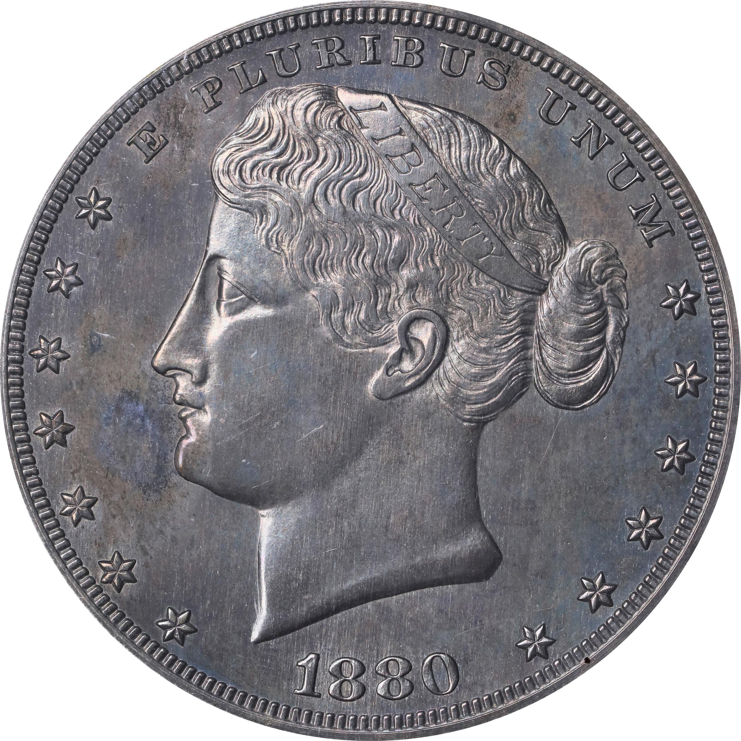 - Struck in standard or goloid silver alloy. <strong>Obv:</strong> Head of Liberty facing let with the Latin motto E PLURIBUS UNUM above, the date 1880 below, and 13 stars arranged around the border seven left, six right. Liberty's hair is tied in a bun and she wears a ribbon around the top of her head that is inscribed LIBERTY. <strong>Rev:</strong> The inscription 895.8 S. / 4.2 - G. / 100 - C. / 25 GRAMS is centered within a beaded circle, outside of which is a wreath of corn and cotton. The Latin motto DEO EST GLORIA is inscribed within an ornamental cartouche at the top of the wreath. The legend UNITED STATES OF AMERICA is inscribed along the upper border and the denomination ONE DOLLAR is inscribed along the lower border. A deeply toned piece with dominant charcoal-olive and midnight blue patina. The underlying fields are flashy and reveal iridescent highlights of blue, pink and gold when the coin dips into a light. The <em>uspatterns.com</em> website accounts for only about a dozen examples of Judd-1648 in silver.
