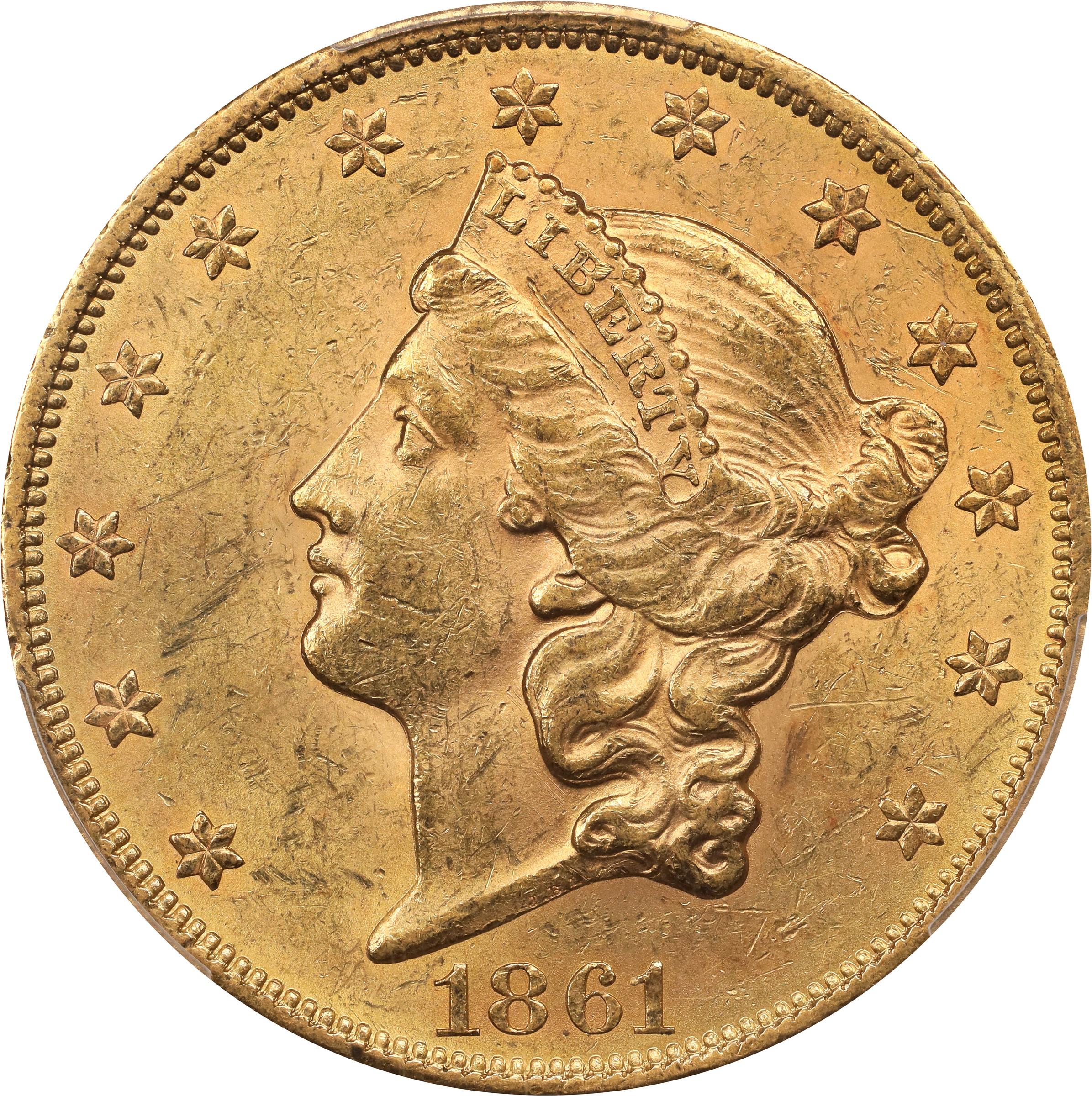 - Satiny luster shines forth boldly from handsome pinkish-honey surfaces. The 1861 double eagle has long been sought after as the preferred issue for type collections courtesy of its generous mintage of nearly three million pieces. Fortunately, due to the general suspension of specie payments by larger banks at the outbreak of the Civil War, a number of Mint State specimens survive to this day and are eagerly sought by both gold type collectors and double eagle enthusiasts.