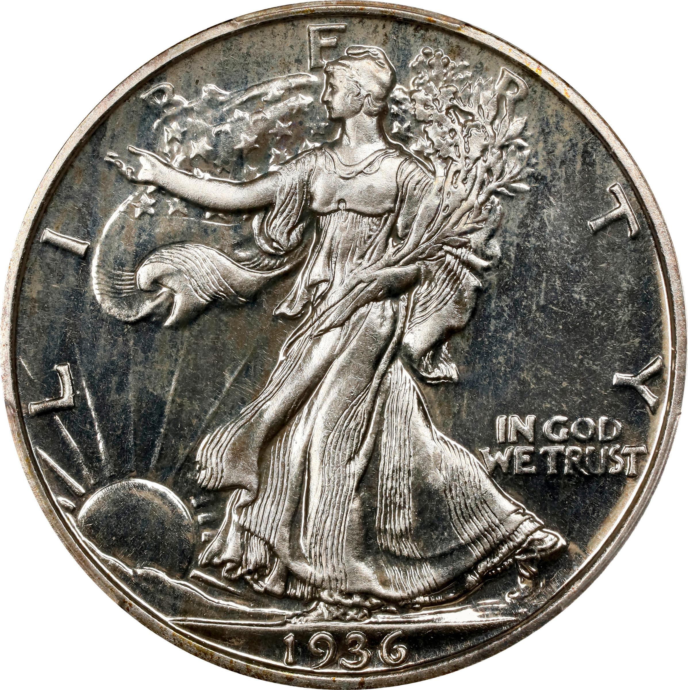 - An elegant specimen with virtually untoned surfaces that show appreciable contrast between reflective fields and lightly frosted motifs. The first Proof half dollar struck in the United States Mint since 1915, and the first of the Walking Liberty design type, the popularity of the 1936 with today's collectors knows no bounds. This is also the key date issue among Proof Walkers, the mintage of 3,901 pieces lower than that of the other six issues in this brief Proof series. The number of coins made available to collectors was only 3,874, the remaining 27 pieces reserved for assay; all of the former had been distributed to contemporary numismatists by the end of January 1937. Eagerly sought at all levels of preservation, the 1936 is of particularly interest to advanced collectors in grades above Proof-65, as here.
