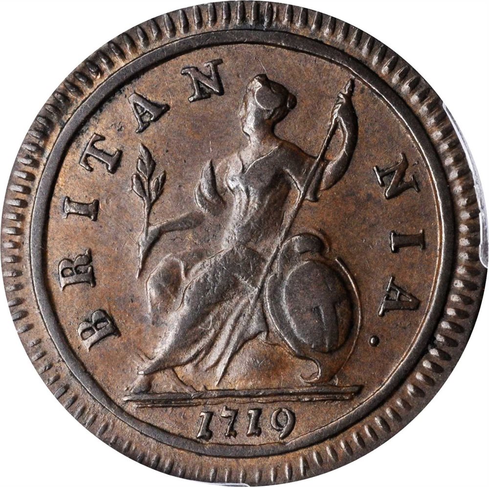 - GREAT BRITAIN. 1/2 Penny, 1719. London Mint. George I. PCGS AU-50 Gold Shield.