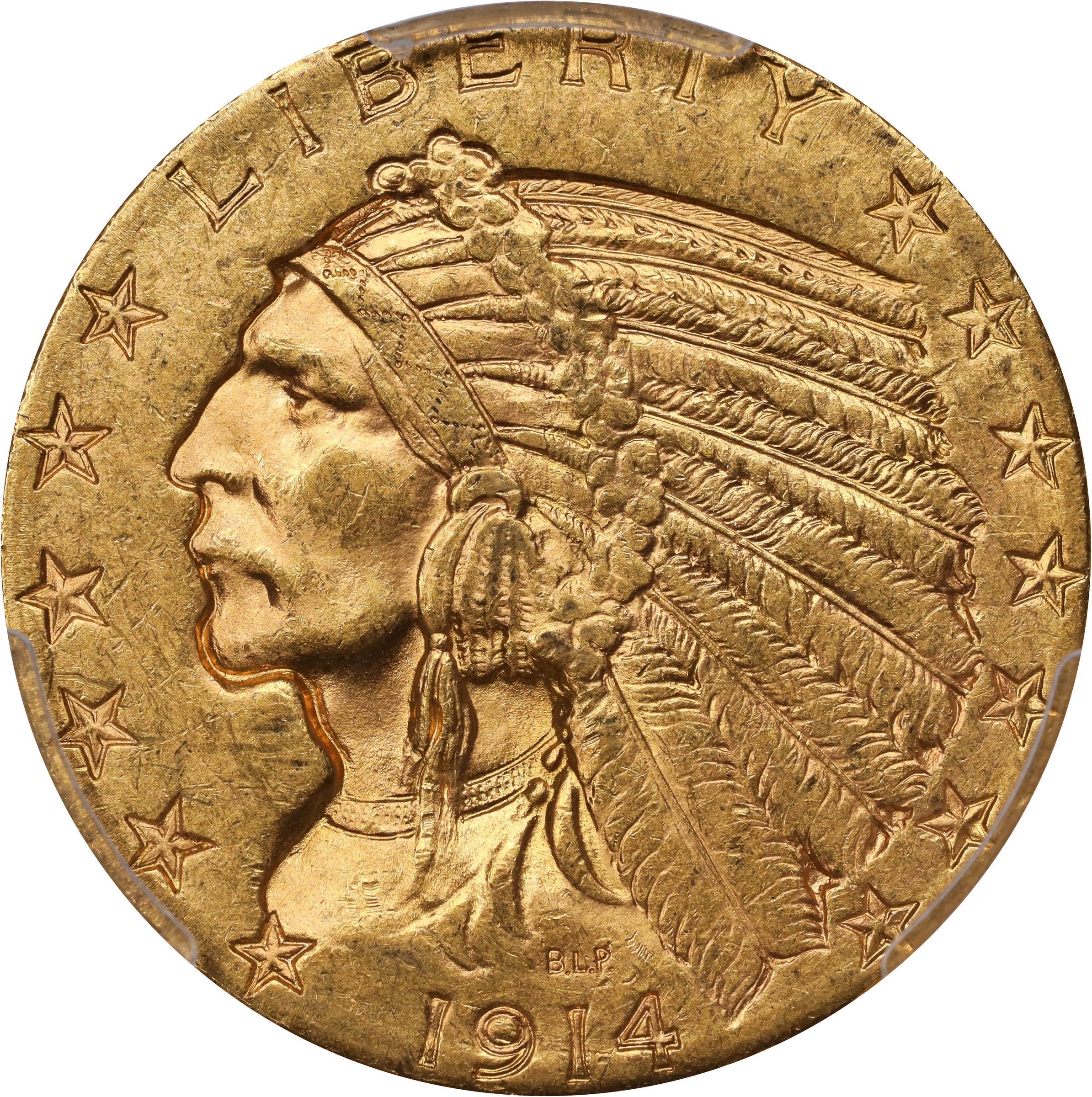 - An attractive honey-gold and pale olive coin well a well executed strike that includes a bold S mintmark. Lustrous and softly frosted with attractive originality. As one of the rarest 20th century U.S. Mint gold issues of any denomination in MS-64 and higher grades, the 1914-S half eagle represents a significant find at all levels of Uncirculated preservation. This premium quality and aesthetically pleasing BU example represents outstanding value for astute gold enthusiasts. Sure to see spirited bidding.