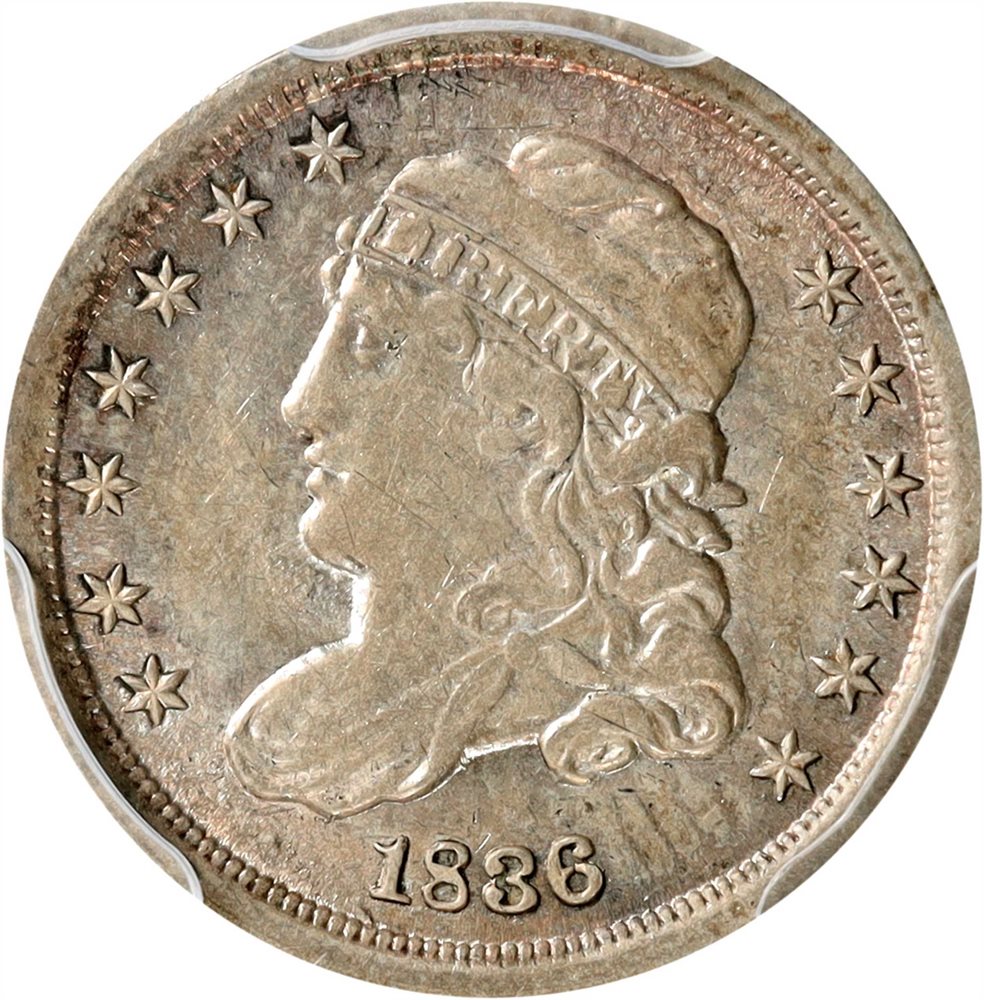 - 1836 Capped Bust Half Dime. LM-6. Rarity-3. Large 5 C. AU-58 (PCGS).