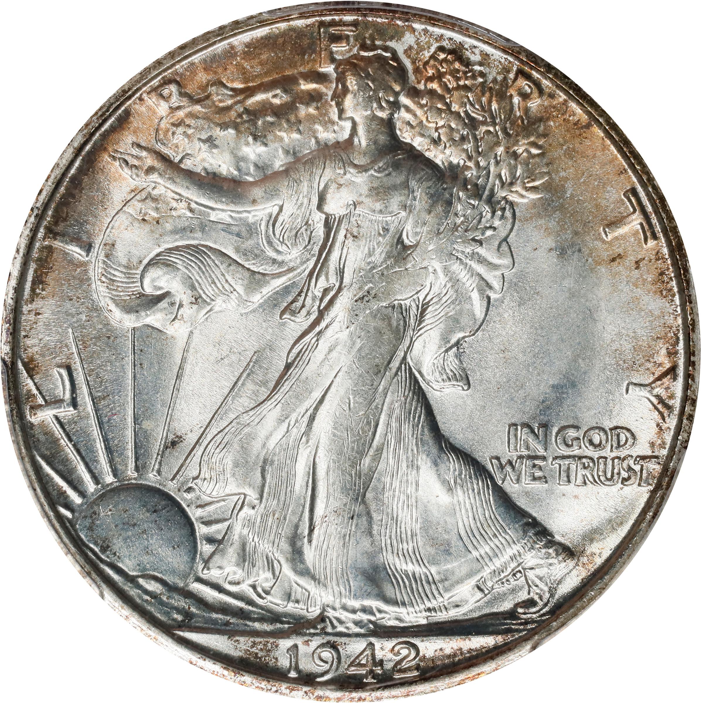 - Smooth, soft mint luster flows over surfaces that are brilliant in the centers, attractively toned in golden-russet iridescence around much of the peripheries. Trailing only the 1941-S, the 1942-S is the scarcest Walking Liberty half dollar "short set" issue in the finest Mint State grades. With a mintage of 12.7 million coins, the 1942-S half dollar is readily available in grades up through MS-65, but becomes progressively rarer as one advances into the uppermost reaches of the numismatic grading scale. Furthermore, striking quality also presents a significant challenge, as a combination of die fatigue and inconsistent striking pressure resulted in poor detail and inferior luster even on many well preserved examples. This PCGS/CAC MS-66+ is well above average in both respects, and it also offers outstanding visual appeal.