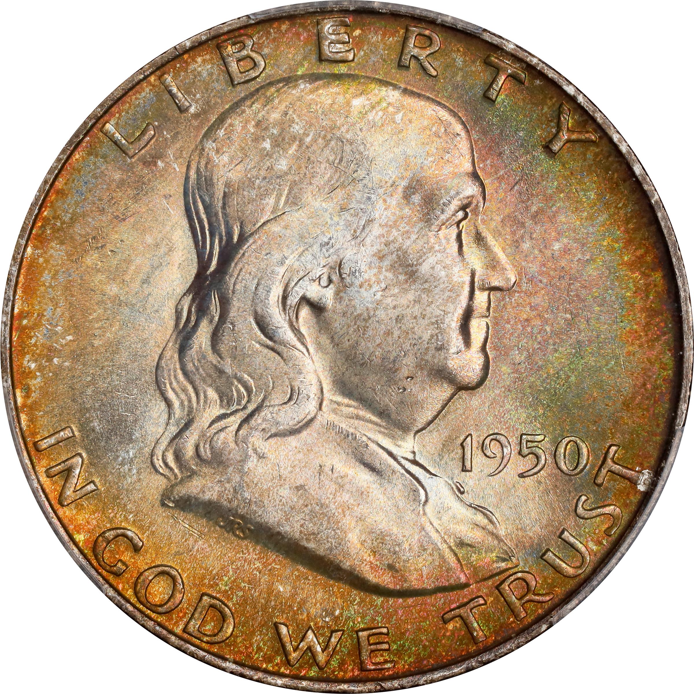 - Dazzling iridescent toning greets the viewer from both sides of this stunning Superb Gem. The toning includes colors of orange-russet, pinkish-silver, sandy-gold and pale olive that are boldest at the borders. Lustrous and satiny in texture with a virtually pristine appearance to razor sharp features.<p>A mintage of 8,031,600 coins sufficed for the Denver Mint to meet the Treasury Department's order for half dollars in 1950. This issue's characteristics are typical for an early date D-Mint Franklin half dollar: most Mint States examples are sharply struck and qualify as Full Bell Lines, but most are also very heavily abraded. Writing in the fourth (2023) edition of his <em>Guide Book of Franklin & Kennedy Half Dollars</em>, Rick Tomaska reinforces this point when he states that, "Bagmarks are a serious problem for this date." The author further observes:<p><em>The 1950-D ranks among the rarest issues in the series in superb color-toned condition. The fact that Mint sets were not issued in 1950 is the primary cause.</em><p>It is truly remarkable, then, that the offered coin is not only exceptionally well preserved in Superb Gem Mint State, but that it is also vividly and attractively toned. Clearly this is an offering that deserves the undivided attention of astute Franklin half dollar enthusiasts.