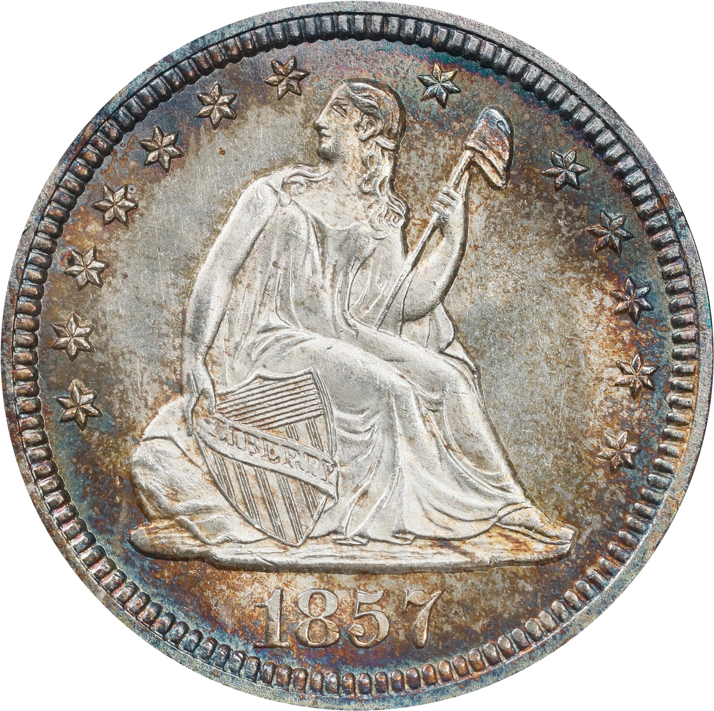 - The glistening vanilla centers of this enchanting Superb Gem are cradled by bold peripheral halos of reddish-bronze and cobalt blue. Dense, satiny luster blankets the design elements, subtly contrasting with the lightly reflective fields. The surfaces are effectively pristine and without a single consequential blemish. In 1857, the Philadelphia Mint struck 9,644,000 quarters for circulation, the third largest mintage of the entire Liberty Seated design type. Because of its relative availability in grades up to and including Gem Mint State, the 1857 is often chosen by type collectors who desire excellence. Above MS-66, however, the situation changes and the population figures drop sharply (and likely include a few resubmissions). The advanced numismatist would be well advised to pay close attention as this stunning example that is so very close to the pinnacle of quality for this issue crosses the auction block.