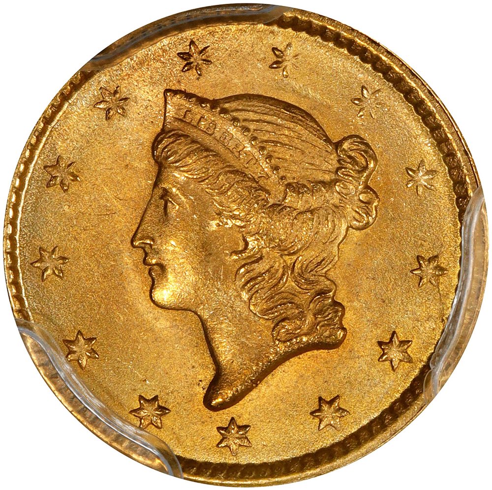 An appealing, conditionally rare example of the first design type in the United States Mint's circulating gold dollar series. Lustrous and satiny surfaces remain pristine beneath a glass and exhibit a pleasing blend of reddish-rose and green-gold color. Fully struck, expertly preserved with remarkable definition on Liberty's hair, this is simply a delight to behold.