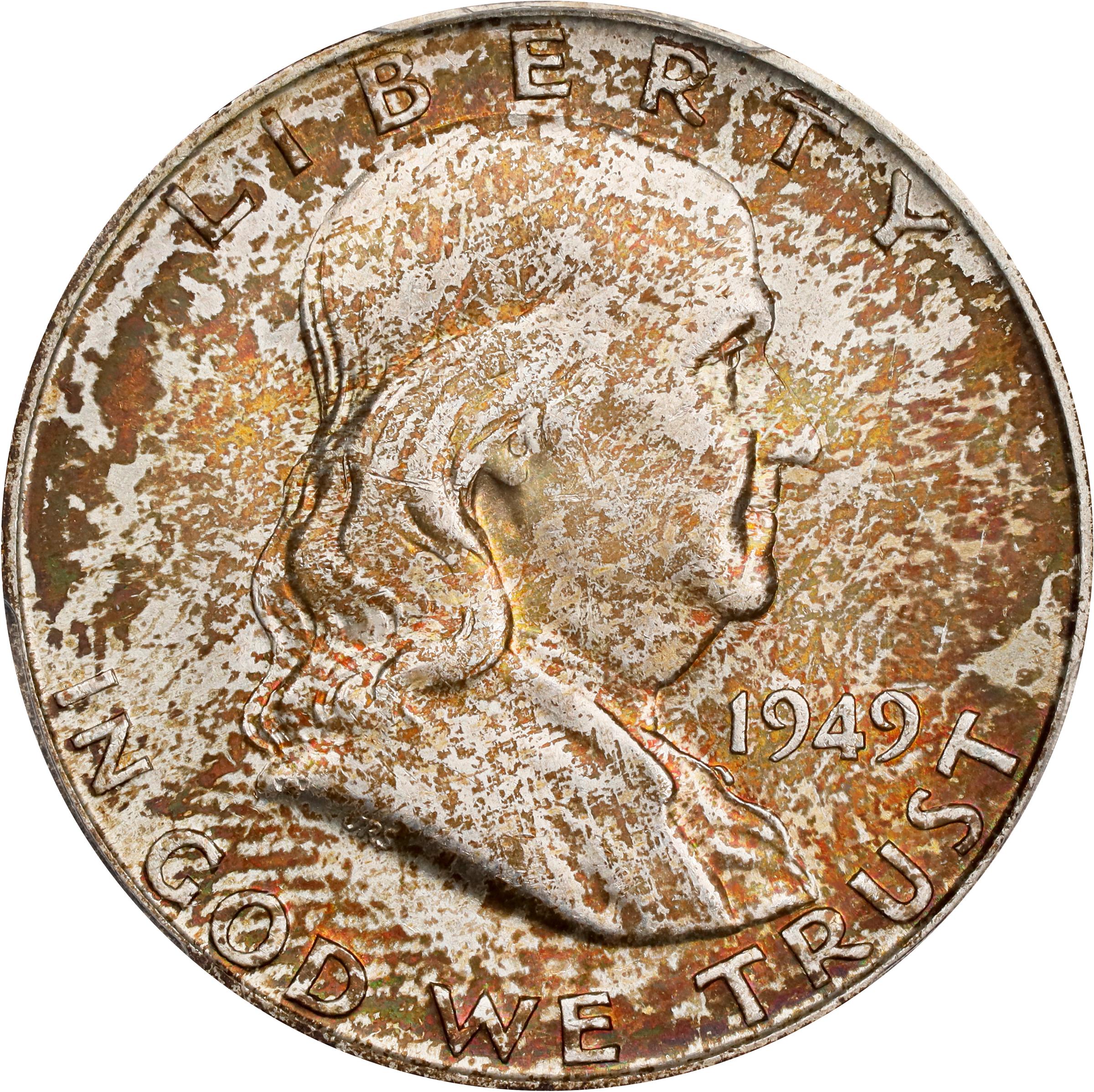 - This is almost certainly a former Mint set coin, as are many Gem Uncirculated examples of this second year Denver Mint Franklin half dollar issue. Smooth, lustrous surfaces are dusted with mottled reddish-russet patina that is more extensive and pronounced on the obverse. A visually striking coin for collectors that appreciate richly toned silver.