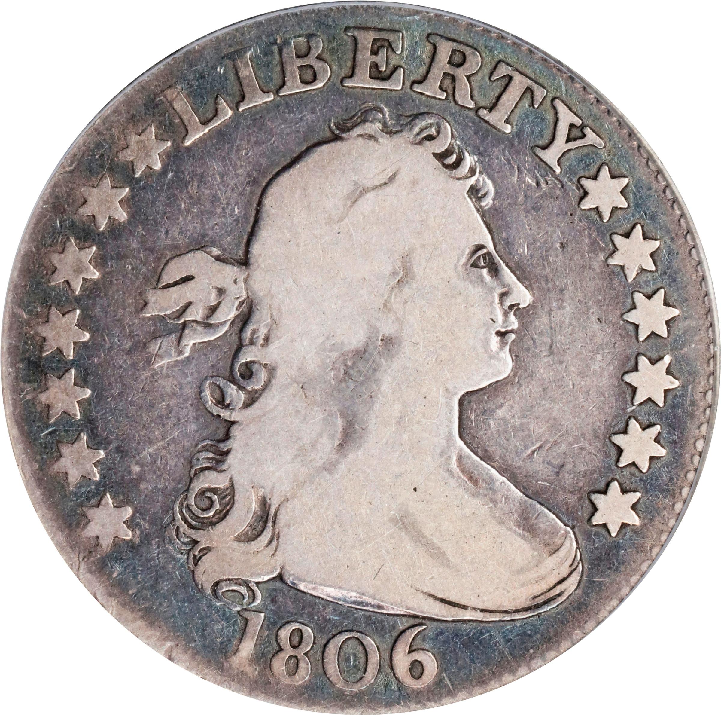 - Tompkins Die Stage 1/4, Rea et al. Die State d, Rarity-8. A leading highlight of the NorthEast Collection, and a highly significant numismatic rarity whose offering in this sale will excite advanced early quarter variety enthusiasts. The Browning-8 is by far the rarest of the 10 die pairings known for the 1806-dated Draped Bust quarter issue. This variety shares its obverse with the 1806 B-6, B-7 and B-10, which die is identifiable by a perfect letter T in LIBERTY with the adjacent R higher at its base. The reverse of the 1806 B-8 is unknown in any other pairing, on which the stem touches the C in the denomination, this letter with repunching at lower left. Such is the rarity of this variety that even in VG-10 the offered coin is included in the 2010 Rea-Peterson-Karoleff-Kovach census, in which it is ranked CC#10 for the B-8 variety in its entirety.<p>This coin is of even greater significance due to the die state. It represents Die State d, as defined in the Rea et al. reference, with a prominent reverse cud break at the border outside the digits 25 in the denomination and the letters UN in UNITED. <em><strong>This is a Rarity-8 die state, with only three examples known, and this is the Discovery Coin</strong></em>. It is a wholesome, well circulated example with nice gloss on smooth-looking surfaces. Wear is heavy, as expected for the assigned grade, yet evenly distributed with all major design elements remaining bold, where allowed by strike. Generally light silver gray in color, especially on the reverse, the obverse exhibits warm blue-gray toning in the field that provides an attractive circulated cameo appearance for that side. Really a nice piece at the assigned grade level, as confirmed by CAC approval, and of the utmost importance for series specialists.