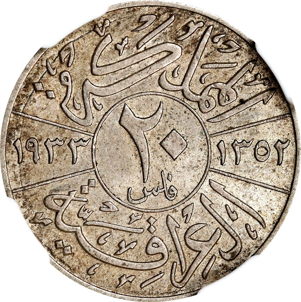 - IRAQ. 20 Fils, AH 1352/1933. London Mint. Faisal I. NGC MS-62.