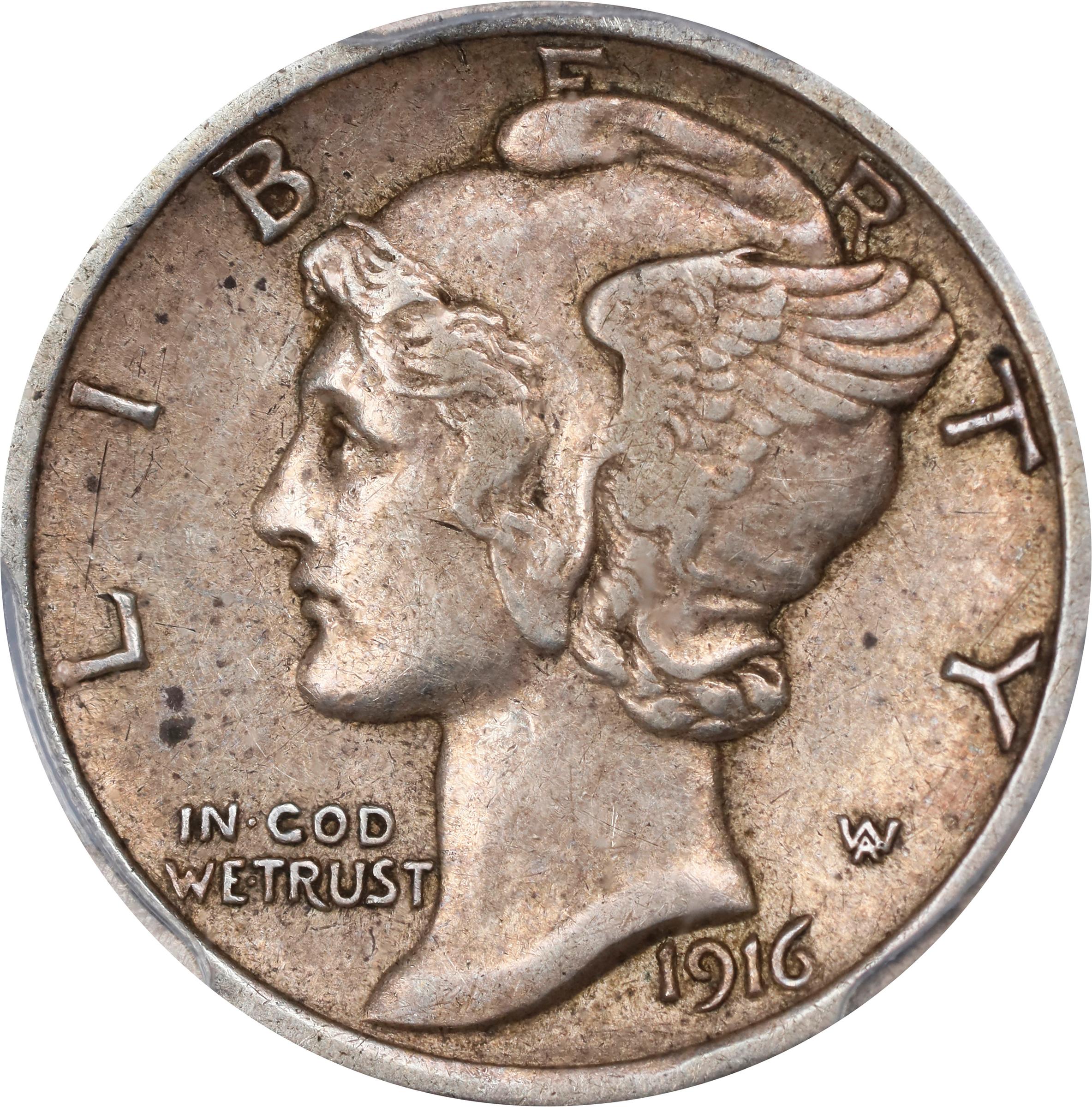 - A grade that we seldom offer for the 1916-D, for this key date Mercury dime is actually more readily obtainable in Mint State; those coins that entered commercial channels stayed there until well worn and, today, the typical survivor is in grades such as Good and VG. The example offered here, however, is minimally circulated with sharp definition remaining to most features. The central reverse crossbands are lightly worn, as befits their positioning on the coin, but the strike appears to have been sharp enough to nearly qualify as Full Bands. There are no troublesome marks, and the surfaces are pleasingly toned in a blend of gold and light mauve-gray. From a mintage of just 264,000 pieces, and an important About Uncirculated survivor of the key date issue in the Mercury Dime series of 1916 to 1945.
