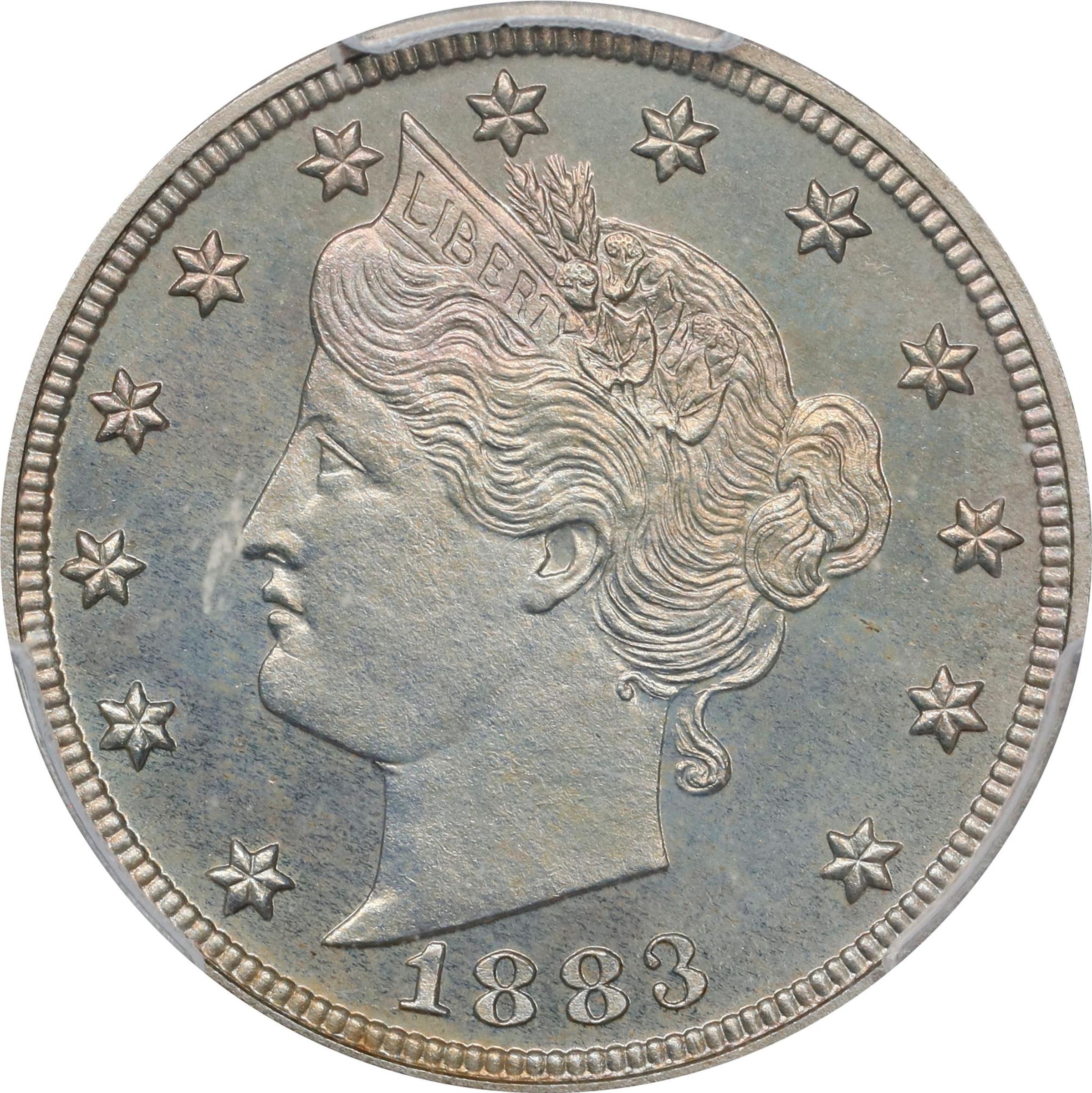 - Handsome toning in smoky silver-apricot blankets serene surfaces. A full strike and appreciably mirrored fields further enhance this coin's exceptional eye appeal. The With CENTS variant of the Proof 1883 Liberty Head nickel is scarcer than an accepted mintage of 6,783 pieces might imply, so much so that some numismatic scholars have questioned the validity of that figure. Q. David Bowers, for one, puts forth a figure of 2,783 coins as more reasonable based on market appearances and, by extension, the number of specimens believed extant. Writing in the 2006 reference <em>A Guide Book of Shield and Liberty Head Nickels</em>, the author believes that many of the Proofs supposedly delivered under the With CENTS banner were actually of the No CENTS design. The former type, produced only in 1883, would probably have been of greater interest to contemporary collectors. If true, and we see no reason to doubt this assertion, then the Mint would have struck more Proofs of the No CENTS type than its With CENTS counterpart to meet contemporary demand. To round out this theory, Bowers believes that the actual mintage of the Proof No CENTS is closer to 9,219 coins than the 5,219-piece mintage published in most numismatic references.<p>In the volume devoted to nickel coinage (2023), John W. Dannreuther also tackles the issue of the mintage for the Proof 1883 With CENTS in his reference <em>United States Proof Coins</em>. He settles on an estimate of 4,000 Proofs struck, based on percentages of coins certified compared to those for the Proof 1885 and 1886 Liberty Head nickels, but concludes with the warning, "The 4,000 estimate herein may still be high..."<p>Regardless of the exact number of coins struck, the Proof 1883 With CENTS is rarer than its No CENTS counterpart in numismatic circles, and (in Dannreuther's words) "this issue [has] one of the lowest percentages of its mintage that PCGS has graded." This is a superior quality example of an underrated issue that is among the finest seen by both PCGS and CAC.