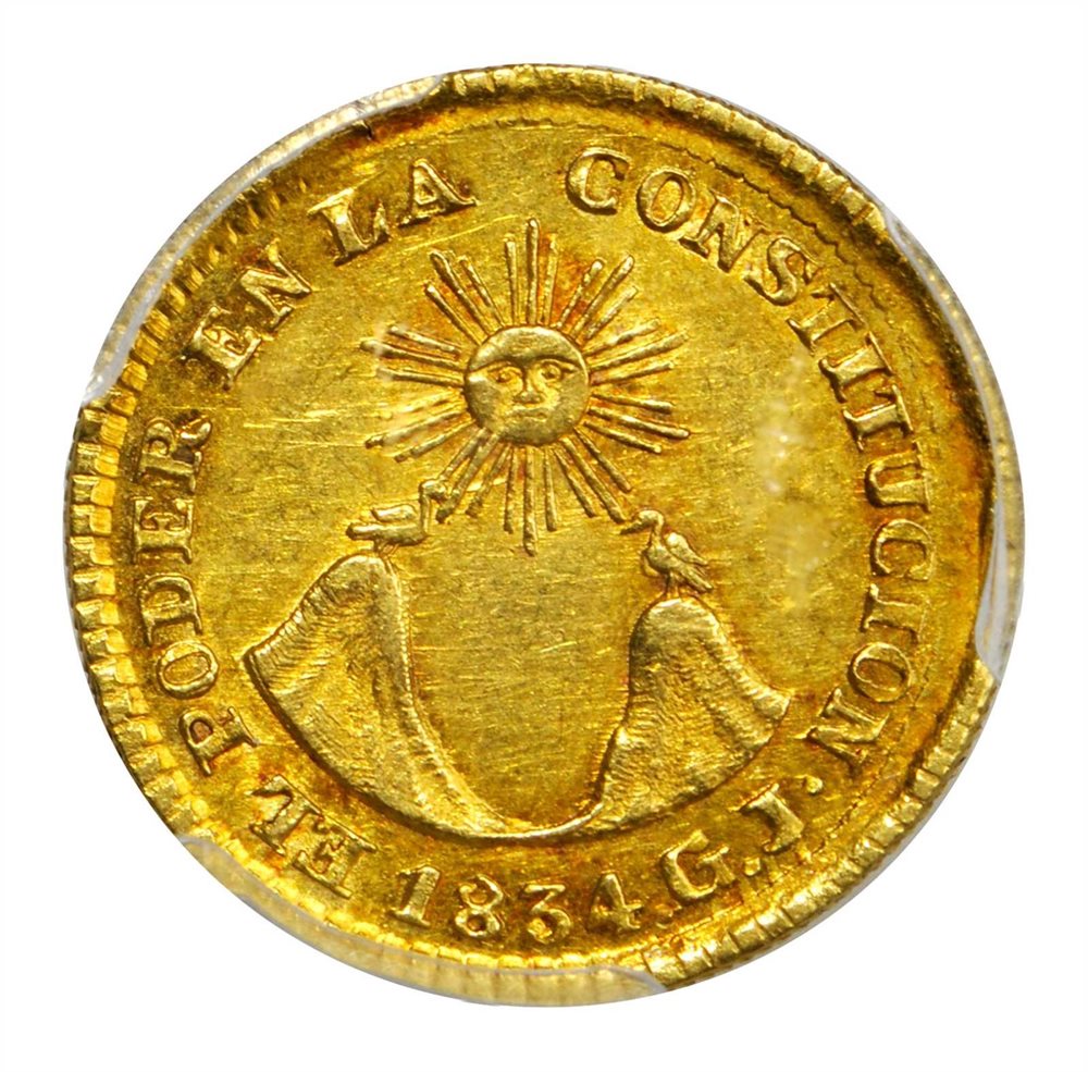 - ECUADOR. 1834-GJ Escudo. Quito mint. KM-15. AU-55 (PCGS).