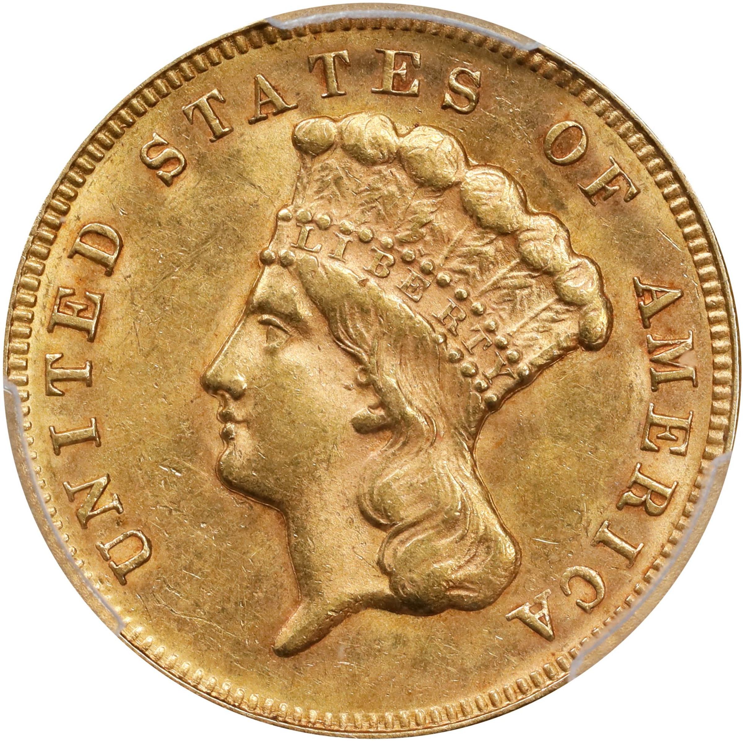- Handsome rose-orange and olive-gold surfaces with a bold strike and lively frosty to semi-prooflike luster. With its only real contender the 1878, the 1874 is the second most plentiful issue in the challenging three-dollar gold series of 1854 to 1889. This attractive example would make a pleasing addition to a Mint State gold type set.