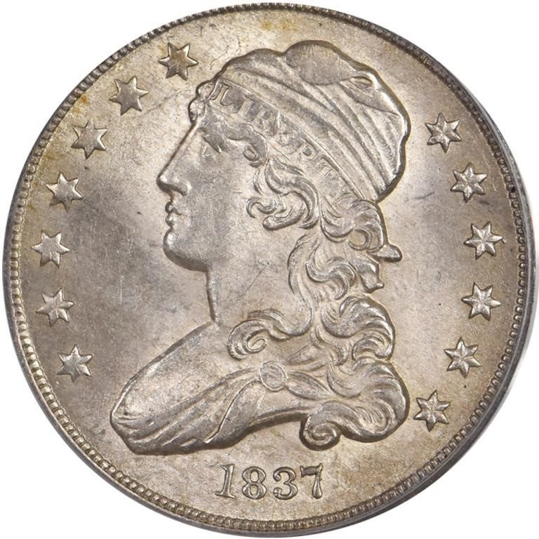 FROM THE MHS COLLECTION A very CHOICE and frosty B-2, clearly within the two main Bust quarter Condition Census listings. A generally well executed blow from the dies imparted most details crisply on to the planchet, only some slight softness is seen, mostly on Liberty's cap and the corresponding portion of the eagle's talon. Mostly a warm silver with antique gray and the clearest gold iridescent toning is brought out nicely by the thick mint frost. The eye appeal is quite pleasing for sure! PCGS 27, NGC 27, CAC 5. We sold the most recent example for $6,169 in our February 2021 Regency Auction. In today's stronger market, the CAC CPG value is listed at $7,310 and the PCGS Price Guide value is listed at $9,000. While PCGS reports 25 graded higher, these are NOT common; the last one sold nearly three years ago for over $20,000. This very pleasing MS64 will fit nicely in any carefully selected collection and will see stiff bidding competition. Good luck. Cert. Number 11285433 PCGS # 5356