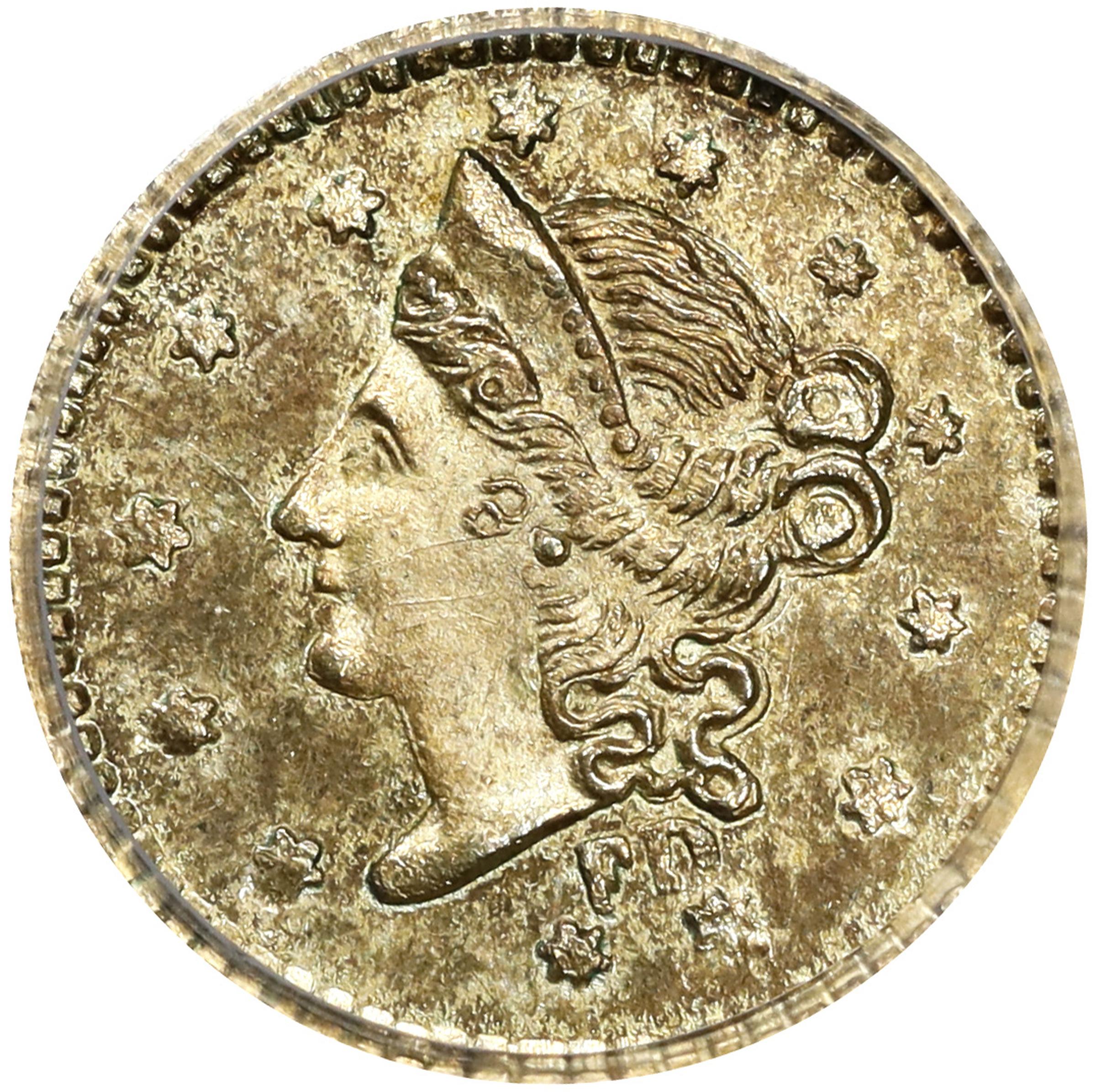 - This rare and significant variety is one of just two of the round 50 cents denomination that displays the maker's initials FD - for Frontier, Deviercy & Co. - prominently on the obverse. The other is the nearly as rare BG-404, and the two were actually coined from the same obverse die. Writing in the 2003 edition of the Breen-Gillio reference California Pioneer Fractional Gold, Bob Leonard enumerates just nine examples of BG-403. Of those, one is plugged, and it is noted that there may be some duplication in the listings, which probably explains the "7 to 9 known" provided by PCGS CoinFacts. No matter the actual number, the present piece is among the finest known when compared to the coins in the Leonard census. This lightly toned Choice Mint State example will be a welcomed addition to another specialized cabinet. Only one other BG-403 appears in our online archives, also a PCGS MS-63 coin that realized $5,760 in our August 2021 sale of the Oregon Collection.