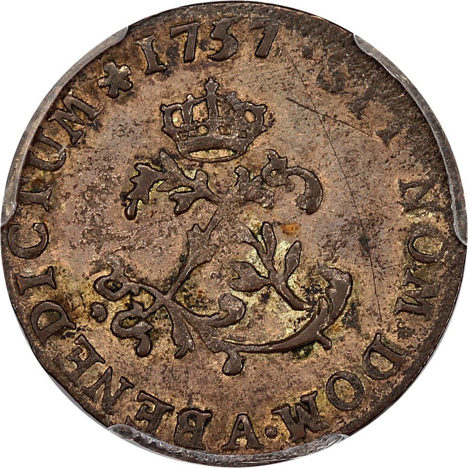 - 1757/6-A French Colonies Sou Marque PCGS AU53