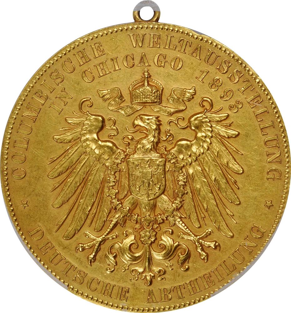 - GERMANY. Empire. World's Columbian Exposition/German Delegation Gold Award Medal, 1893. PCGS Genuine--Tooled, AU Details Gold Shield.