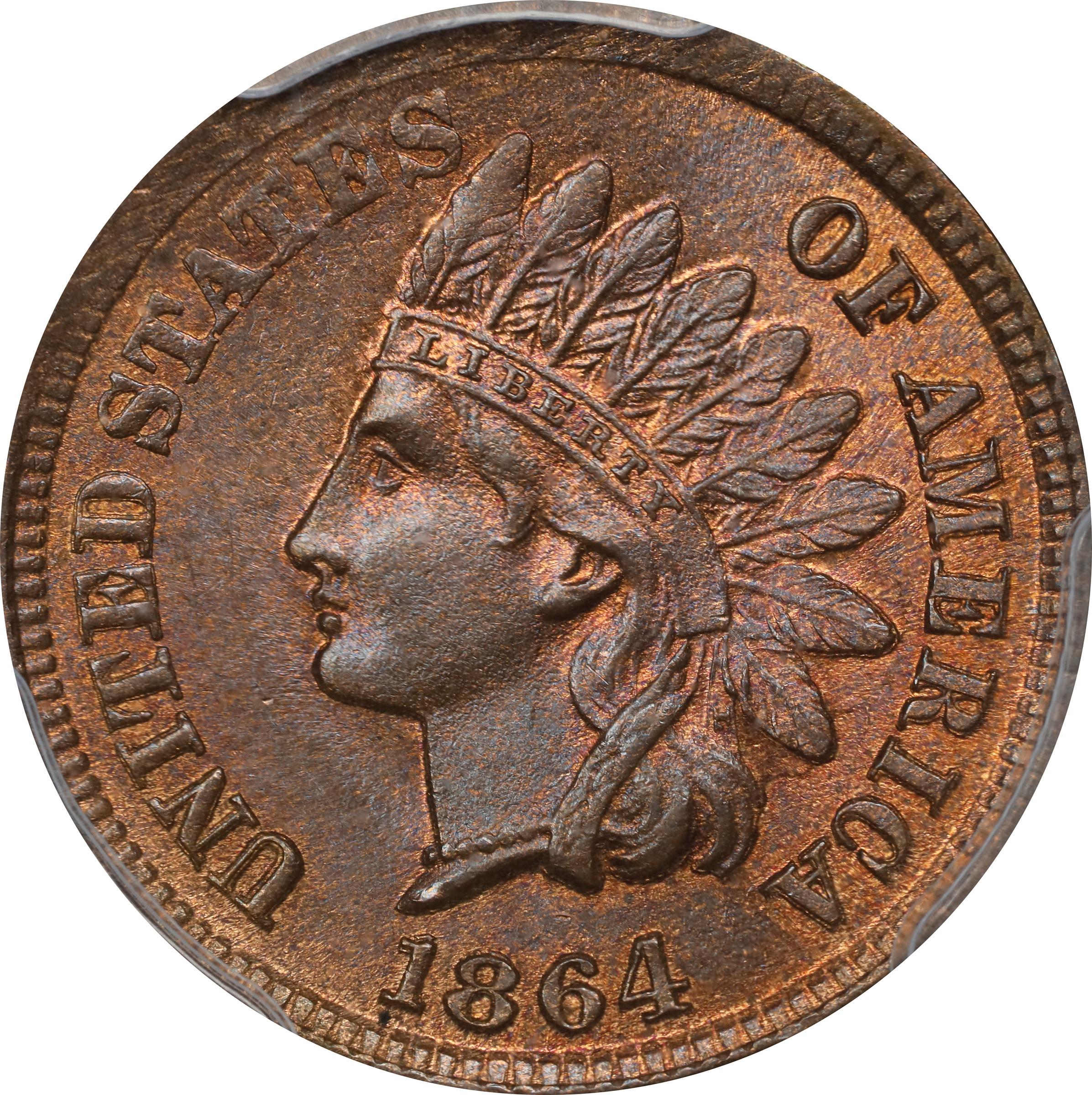 - A high end Gem example of the third and final variety of the 1864 cent, featuring designer James B. Longacre's initial L on the ribbon. Lightly toned in olive-gray, and then again mostly on the obverse, plenty of vivid mint orange color remains. Well struck, although both dies were heavily worn and eroded when this coin was produced. Softly frosted in texture with expectably few blemishes for the assigned grade. The Snow-5a attribution provides additional appeal, although it is not noted on the PCGS insert. Repunching to the digits 18 in the date is still discernible despite the advanced die state; the reverse also shows several cracks and areas of die swell around the periphery. An intriguing piece for the specialist, and also a conditionally rare one in a Mint State 1864 L on Ribbon Indian cent.