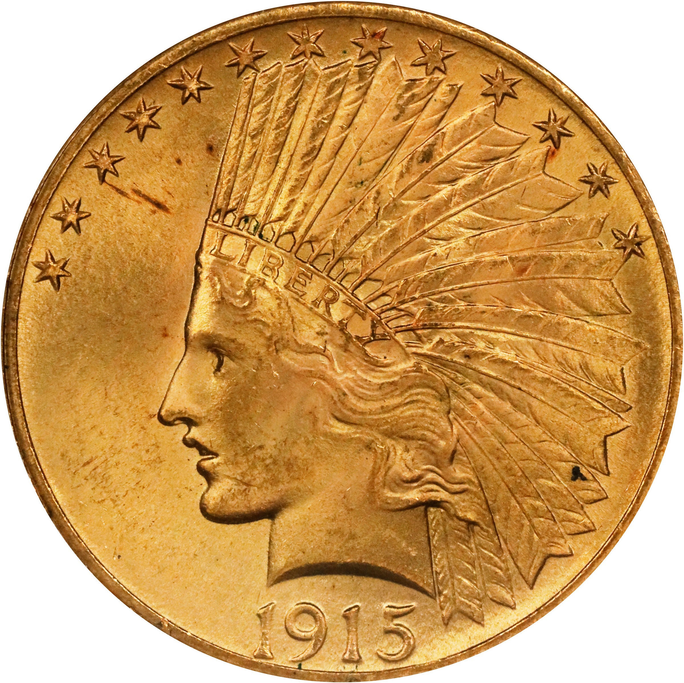 - Drenched in frosty mint luster and vivid green-golden patina, this carefully preserved example would do wonders for high grade gold type or date set. The 1915 issue is a popular choice among collectors seeking a single coin to represent the challenging Indian eagle. It is one of the most available issues of its type in high grade and is often encountered with exceptional eye appeal, as seen here.