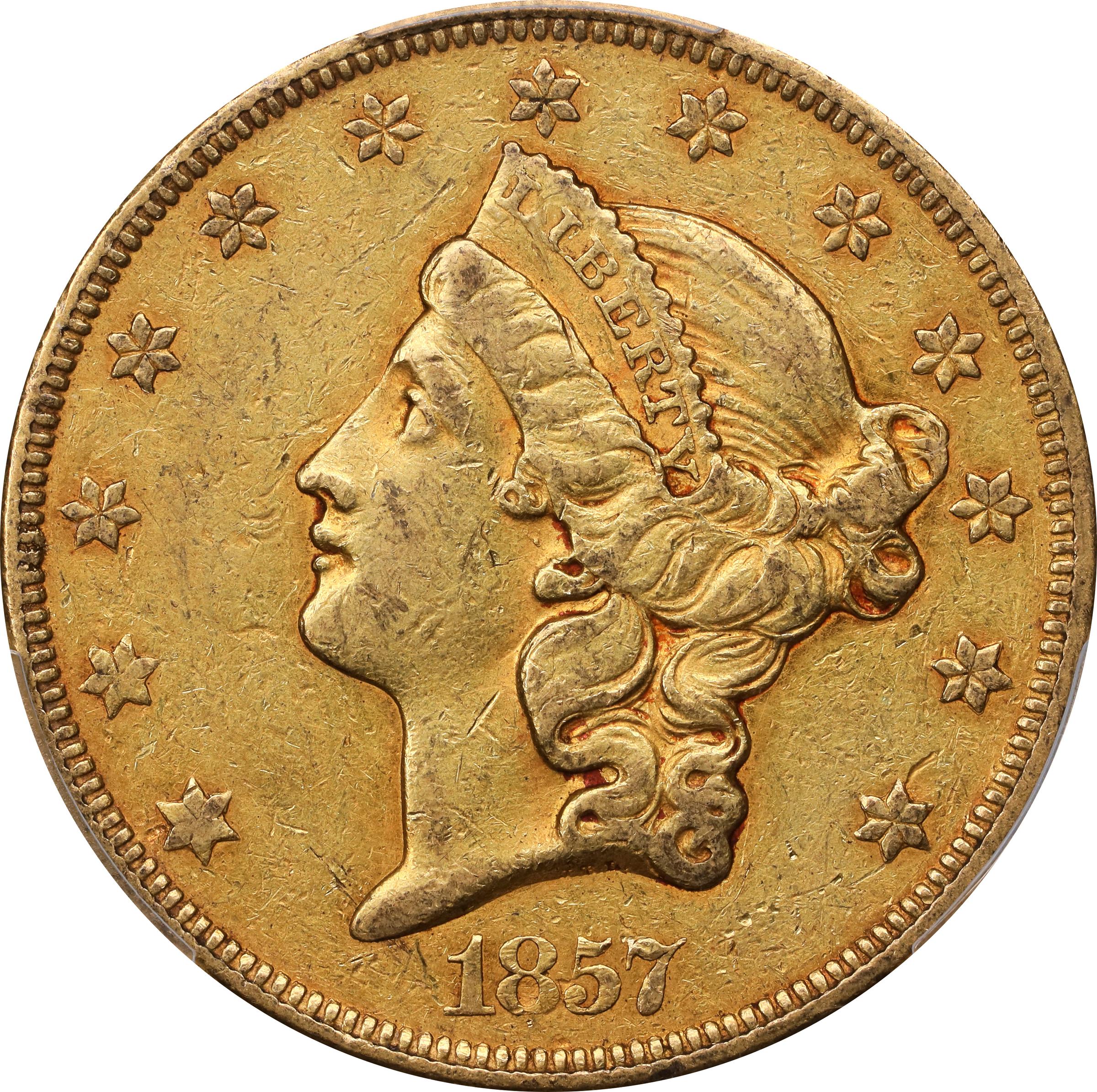 - This is an exceptionally attractive, very scarce Choice EF example of an issue that is elusive even in lower circulated grades. Beautiful original color blankets both sides. Ample evidence of a prooflike finish can be seen, reflectivity most pronounced in the protected areas around the devices. Although most survivors of this issue are softly struck, this piece is well produced by early New Orleans Mint standards. Overall detail is bold, and the O mintmark is fully appreciable, if a tad faint. A premium quality coin for both the issue and the assigned grade that stands tall among the highlights from our extensive Fairmont Collection offerings in recent years.<p>The 1857-O and 1858-O are anomalies among New Orleans Mint double eagles from the late 1850s, being the only two issues from that era with mintages in excess of 10,000 coins. For the 1857-O, government records provide a figure of 30,000 pieces struck. This is still a paltry total in an absolute sense, of course, the New Orleans Mint receiving very little gold bullion from California after the San Francisco Mint commenced coinage operations in 1854. Additionally, the Louisiana facility was closed in the early part of 1857 due to repair work to the building.<p>The 1857-O is in the fourth rarity tier among New Orleans Mint double eagles, ranking alongside the 1858-O. Examples are elusive in all grades, Douglas Winter (<em>Gold Coins of the New Orleans Mint: 1839-1909</em>, 2025) providing for just 250 to 300 coins extant. Q. David Bowers takes a stricter approach with an estimate of 90 to 150 survivors in his <em>Guide Book of Double Eagle Gold Coins</em>, although that reference was published earlier (2004). Both authors are in agreement that fewer than 10 Mint State coins are extant. This is one of our very few offerings at the CAC-approved Choice EF in recent decades. Interested parties are urged to pursue this coin with vigor for, once it finds its way into an advanced double eagle collection, it may be many years before an example of comparable rarity and quality appears on the market.