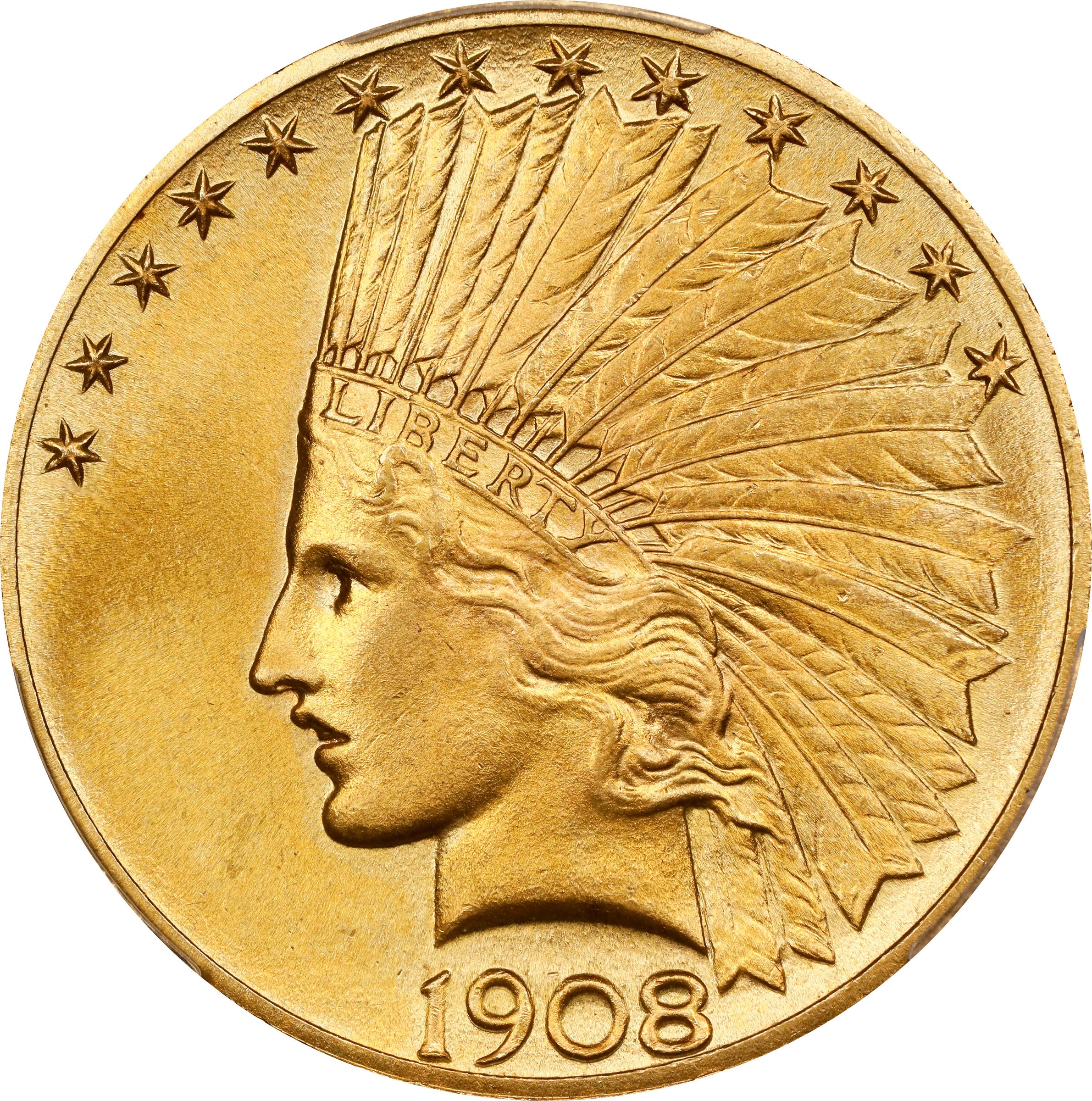 - A coin of incredible quality for this issue or, in fact, any issue from this series. Strong mint luster is seen throughout with beautiful color in vivid rose-orange providing strong eye appeal. The strike is exceptional, the detail razor sharp to full overall. This piece is solidly in the Condition Census for the 1908 Motto $10 and would serve as a focal point in even the finest gold type set or Indian eagle collection.<p>Augustus Saint-Gaudens' original design for the Indian eagle did not include the motto IN GOD WE TRUST because President Theodore Roosevelt believed it to be sacrilegious. Congress, upset that Roosevelt took this action without their consent, demanded the motto be restored. Chief Engraver Charles Barber modified the dies in 1908 to add it before the eagle's breast on the reverse, where it would remain until 1933. Overall, the quality of 1908 Motto eagles is very high and offers a pleasing example of the design. The Philadelphia Mint coined 341,486 eagles with the Motto added, and even though the issue suffered significant attrition due to the mass meltings of the late 1930s, it is generally available even in the lower Mint State levels. Above Choice Mint State, that situation changes dramatically and the issue rapidly becomes a notable condition rarity. Superb Gem examples are especially scarce and the addition of a coin at this state of preservation is an achievement in and of itself. Delightful in every regard, this coin will readily find a new home in an outstanding cabinet.