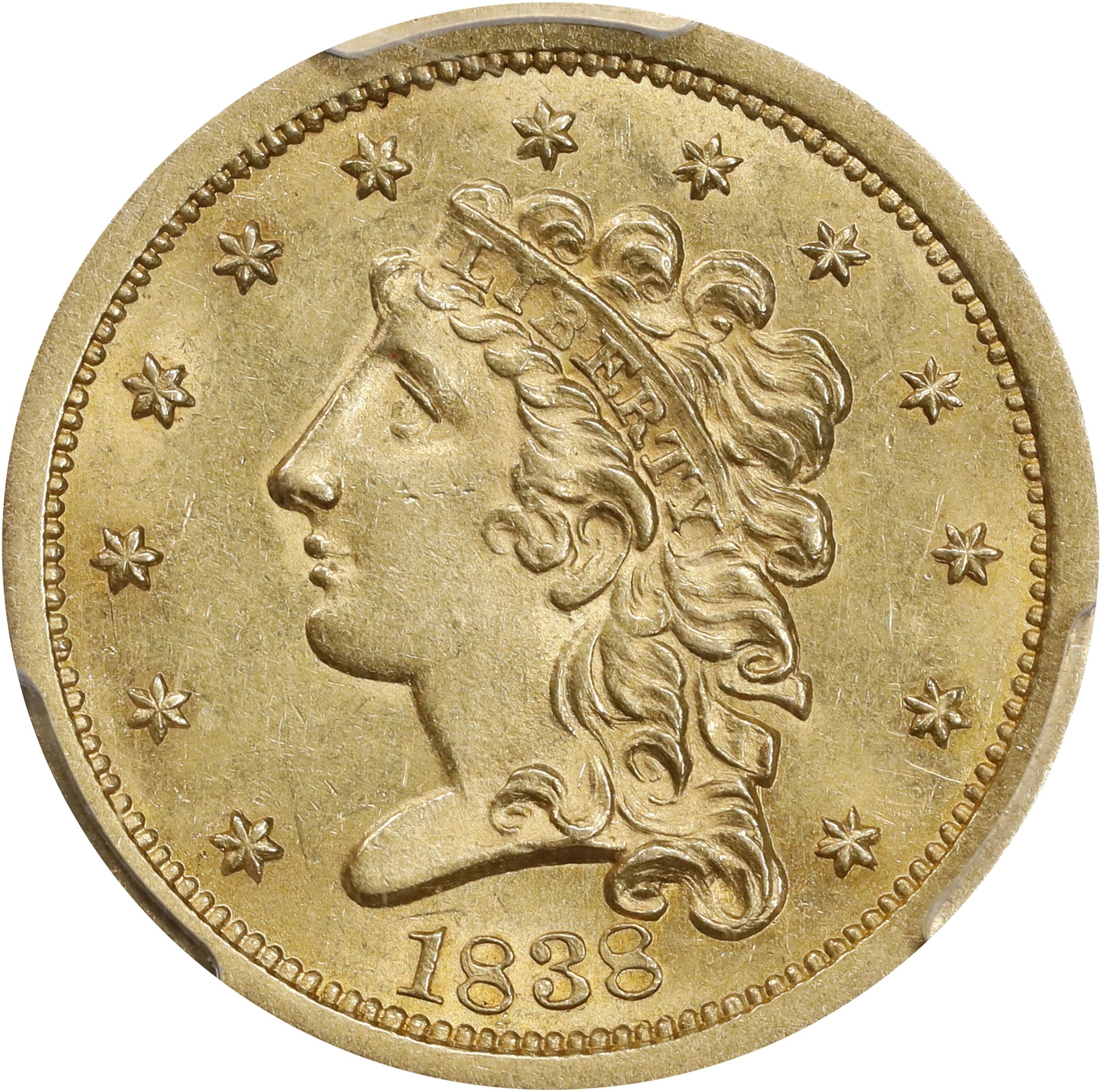 - A handsome golden-honey example that will appeal to advanced gold type collectors and series specialists alike. Boldly impressed with a frosty texture to the finish, the surfaces are far smoother than one might anticipate at the basal BU grade level. The penultimate Philadelphia Mint issue in the brief Classic Head quarter eagle series, the 1838 is not quite as rare as the 1837 or 1839, but is far scarcer than the 1834, 1835 and 1836. In Mint State, as here, the issue is rare and represents a significant find for the astute bidder whenever offered through auction.