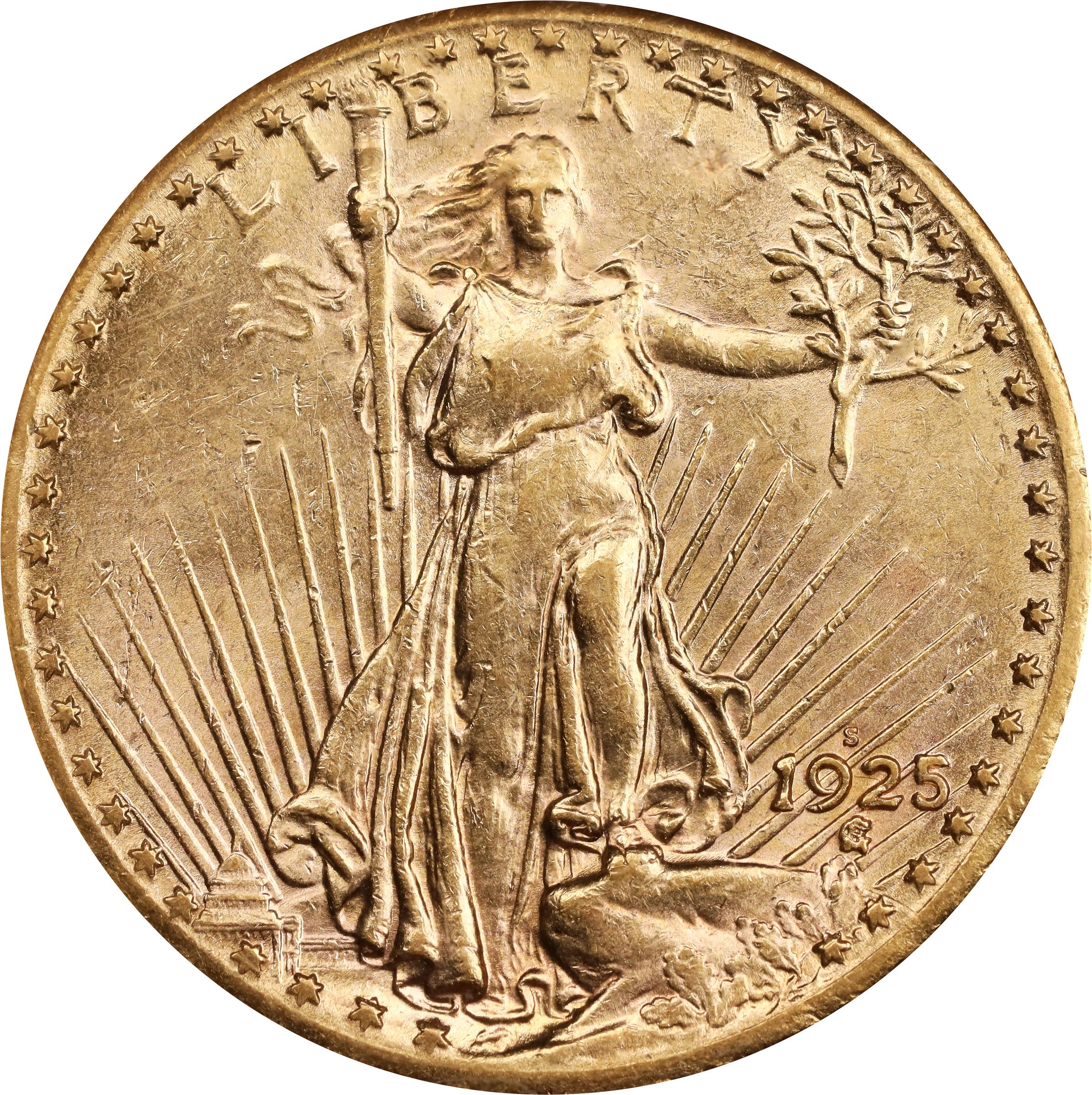 - The 1925-S is one of the most challenging Saint-Gaudens double eagles to locate in high grades, a mintage of 3,776,500 pieces concealing its true rarity. Most of the coins struck were retained in federal vaults until destroyed through melting in the late 1930s. Many of the survivors have been repatriated from foreign bank hoards in recent decades, but the numbers involved are limited to the extent that the 1925-S remains elusive in today's market. Furthermore, this is the only mintmarked double eagle of its era for which approximately half of the extant population is circulated as opposed to Mint State. With relatively limited numbers of coins certified in all grades, this NGC AU-53 example represents a significant find for the advanced double eagle collector.