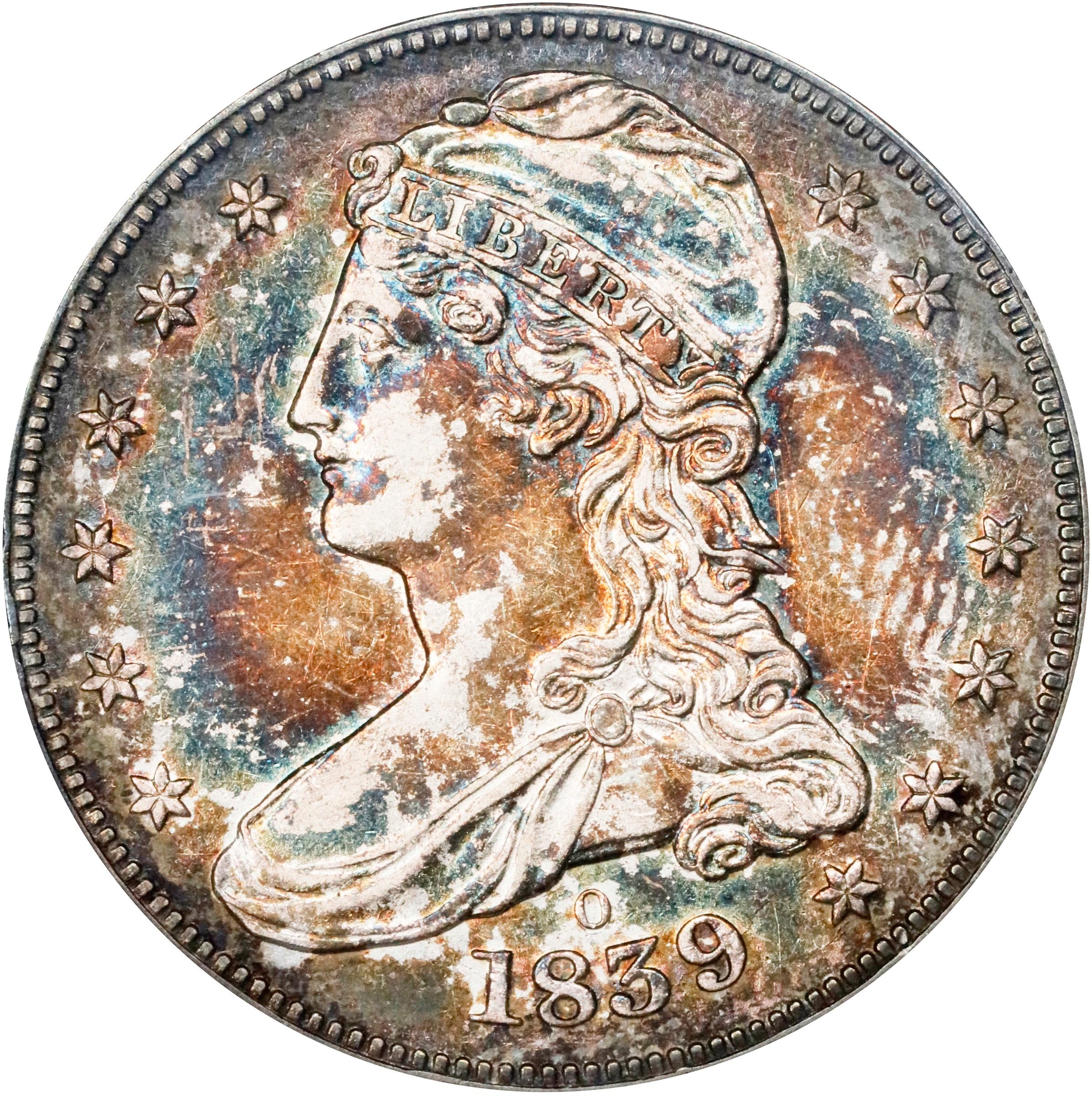 - Warm, mottled cobalt-blue and reddish-russet highlights overlay lightly worn surfaces in a fully original fashion. An appealing example of this ever-popular issue from the earliest years of the New Orleans Mint. Repunching is seen on the O mintmark with close examination.