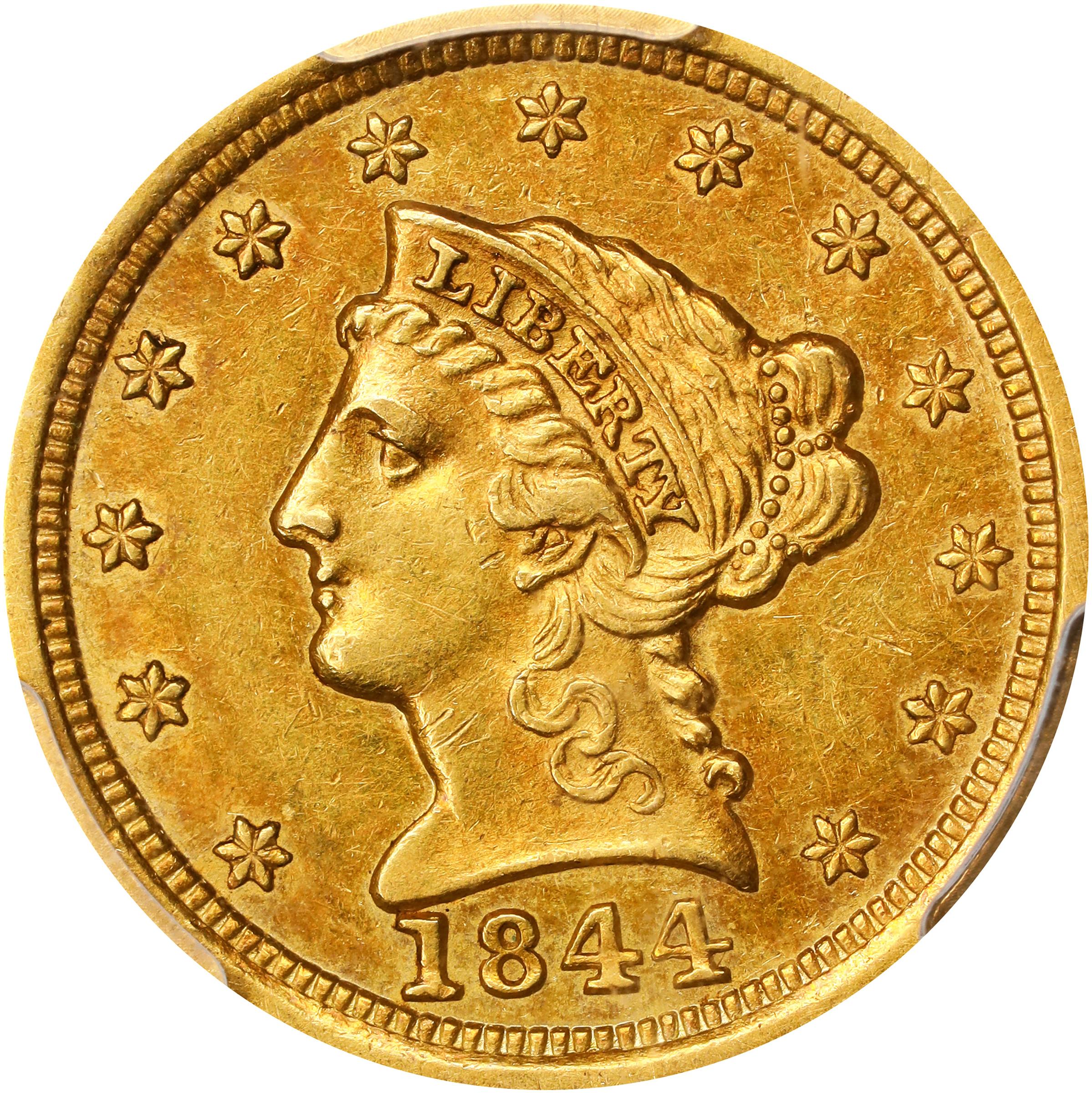 - Wonderfully original and attractive, this generally honey-olive example also exhibit wisps of warm orange-rose color as the surfaces rotate under a light. Strike quality is outstanding for the issuing mint, both sides sharply to fully defined throughout the design. With a mintage of 17,332 pieces, the 1844 quarter eagle from Dahlonega is among the more available issue from the desirable Georgia mint. Survivors are most often in circulated grades, as is typical for pre-Civil War era Southern gold, and they become quite difficult to locate in grades finer than EF. The striking irregularities of coins produced at Dahlonega are part of the charm and the challenge of collecting. The centers are usually found weak, especially on the higher details of Liberty's hair. Doug Winter (2023) estimates that only 25% bear sharp strikes which, when combined with the scarcity of About Uncirculated survivors, explains the considerable challenge of finding an expertly defined 1844-D such as that offered here. This coin also offers rare originality and premium Choice AU preservation that will result in particularly strong competition between astute bidders.