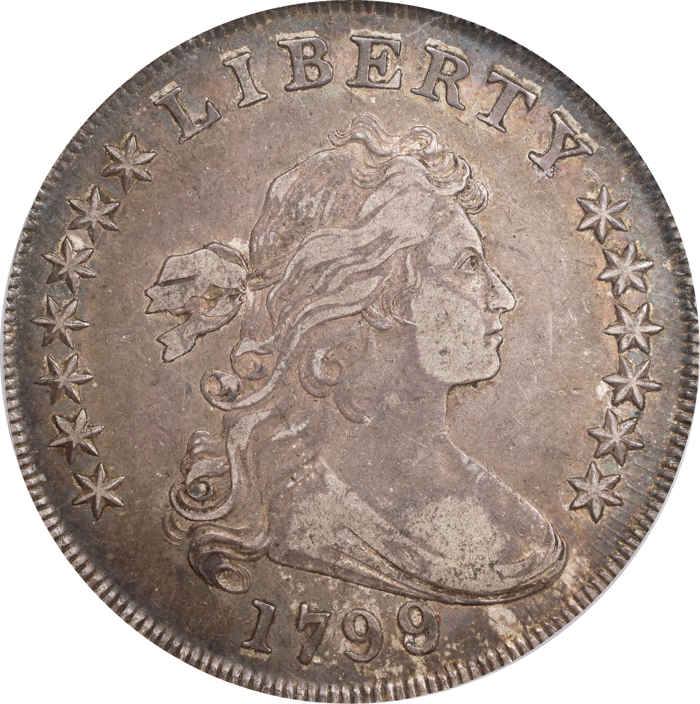 - BB Die State II. A crusty, uncommonly original Bust dollar. The surfaces are pleasingly smooth during in-hand viewing and exhibit rich toning in mauve-gray, olive and steel-blue, with the boldest colors at the borders. Lightly worn overall, but retaining plenty of bold detail throughout the design. BB-141 is one of the most popular and eagerly sought die marriages among 1799-dated silver dollars, combining as it does an overdate obverse die with a reverse die readily recognizable as having a blundered arc star pattern. On the obverse, the final digit 9 in the date has been punched over an 8, remnants of the underdigit quite bold and readily evident even without the aid of a loupe. The reverse exhibits 15 stars above the eagle as opposed to the normal 13, although the additional two stars can be difficult to discern for the uninitiated. They protrude from the first and final clouds, which were enlarged by the engraver to cover most of the extra stars when he realized his blunder. This premium EF example is a truly delightful representative of the BB-141 variety and the overall Draped Bust, Heraldic Eagle type.