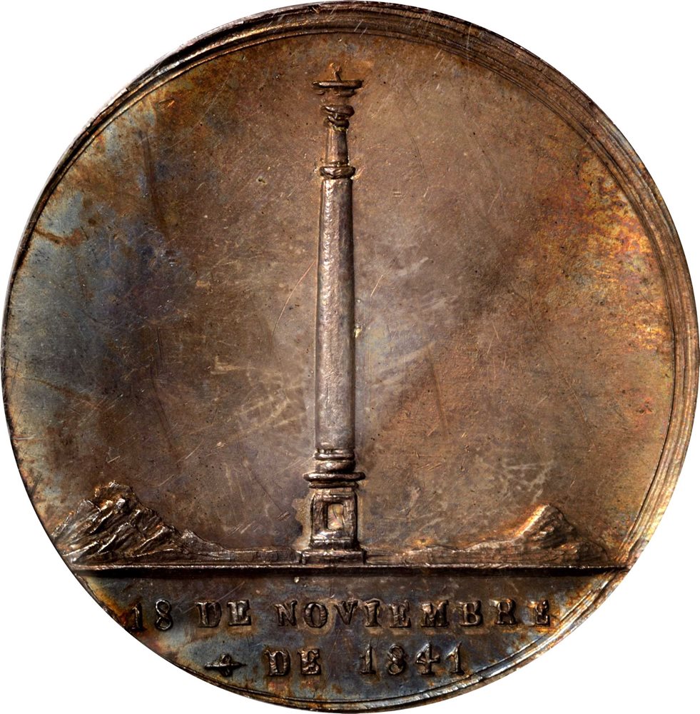 Weight:35.49 gms, diameter: 42.9 mm. A Medal with muled designs, for a literary contest and for the victory at Ingavi. Obverse: Seated figure on throne offering wreath, CERTAMEN LITERARIO / POTOSI around; Reverse: Column, 18 DE NOVIEMBRE / DE 1841 below. A boldly struck Medal with dark, iridescent toning and a few light scratches in the reverse fields.