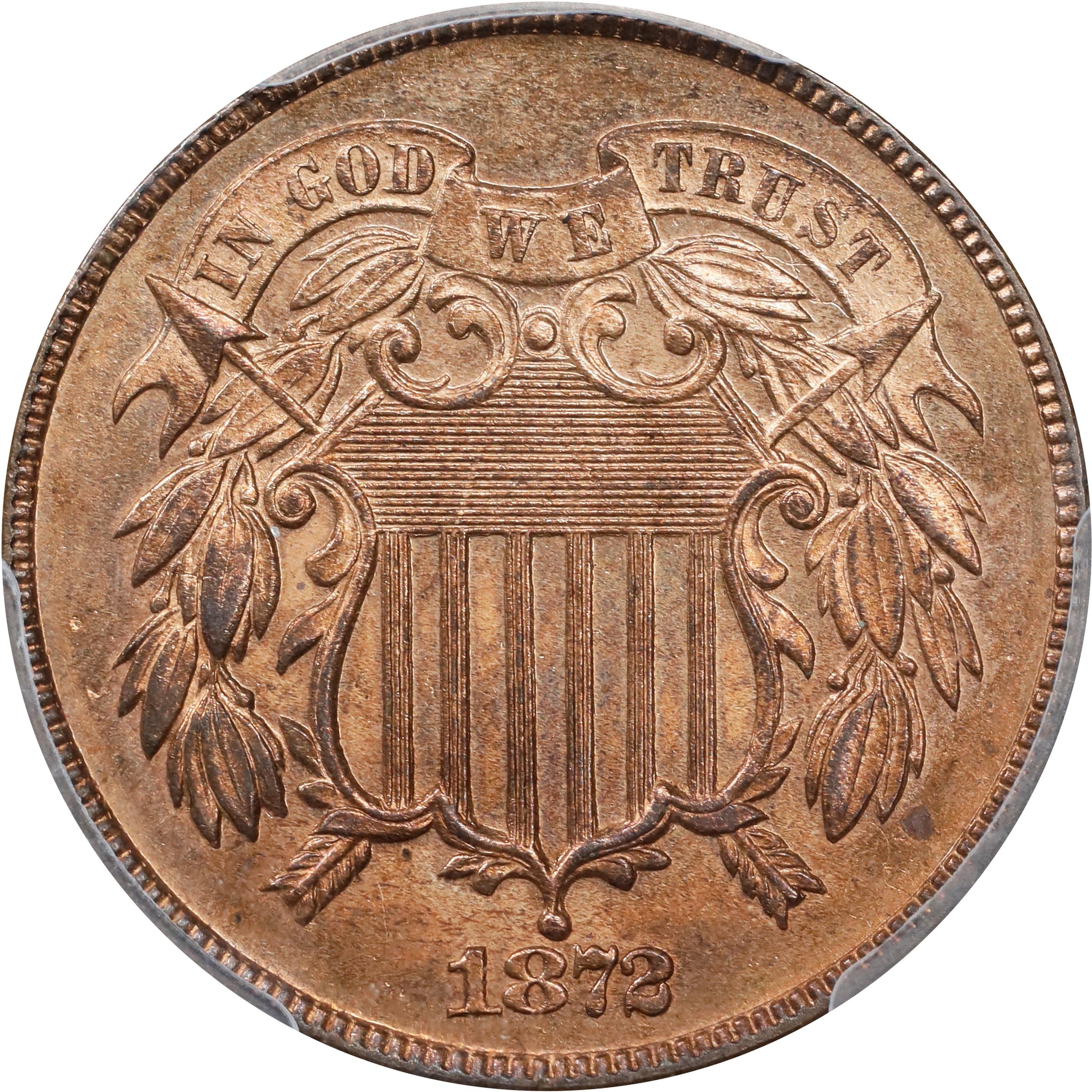 - This vivid RB specimen exhibits gentle golden-brown iridescence to warm medium orange mint color. The strike is full, the finish semi-reflective, and the surfaces are nicely preserved. Given that the circulation strike 1872 two-cent piece is a key date issue with just 65,000 coins struck, this beautiful and conditionally scarce Proof should have no difficulty finding its way into a high grade date set or advanced type collection.