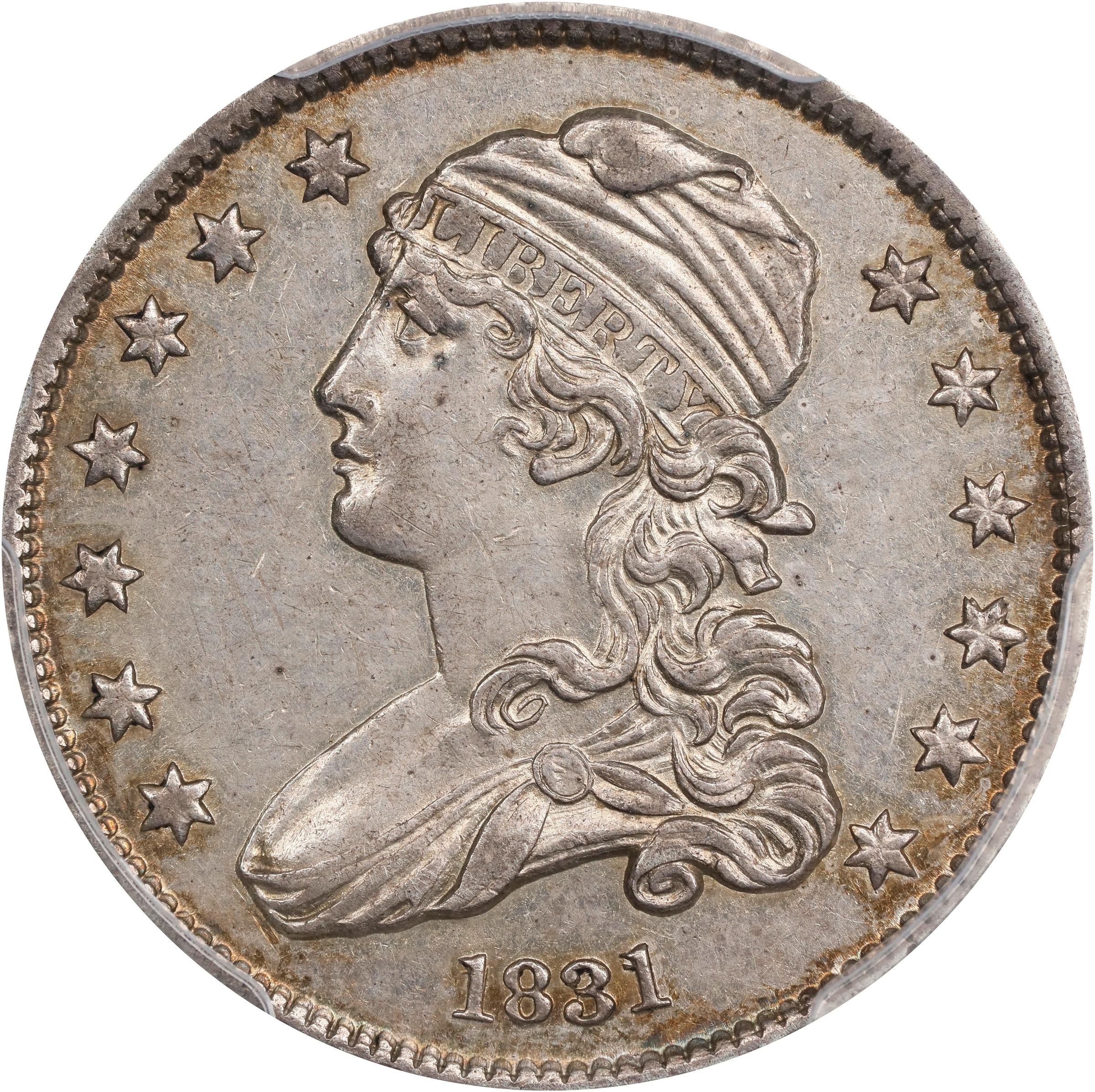 - Tompkins Die Stage 1/1, Rea et al. Die State P. <strong>Tompkins Plate Coin</strong>. A frosty to semi-reflective Choice AU Bust quarter that also retains bold to sharp definition throughout the design. It is lightly toned with wisps of golden-apricot peripheral iridescence framing otherwise silver gray surfaces. Faint hairlines are noted for accuracy, but there are no sizeable or otherwise individually mentionable marks.<p>The 1831 Browning-5 variety combines an obverse also seen in the 1831 B-7 pairing with a workhorse reverse that is seen in three other pairings through 1833. This is a particularly desirable Browning number to represent the Large Letters <em>Guide Book</em> variety, inasmuch as examples are readily obtainable in circulated grades, and also seen quite often in Mint State.<p><strong>Steve M. Tompkins Commentary:</strong> This coin was uncertified when I acquired it, as were many of my early acquisition, and was first certified many years later. It is the only 1831 B-5 I have ever owned; I like it so much that I never bothered to try and upgrade the coin.
