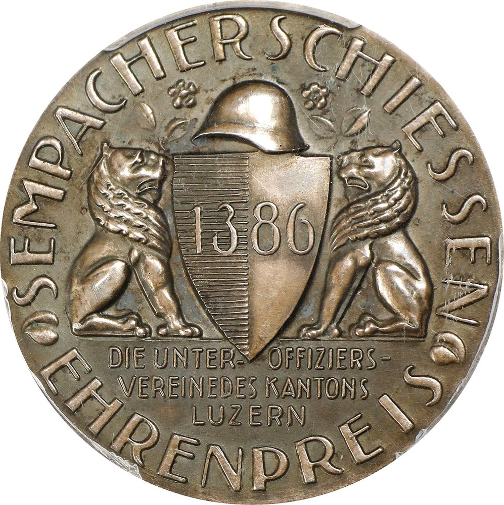 R-897b; Martin-493/A. By Arnold Stockmann, Lucerne. 32mm. Obverse: Arms of Lucerne with "1386" between two facing lions sejant, helmet above, legend below; perimeter legend; Reverse: Angel with spread wings over monument and chapel. A charming example of this type with champagne toning over a medium gray patina. Listed as "Rare" in Richter. Comes with display box from before being certified.