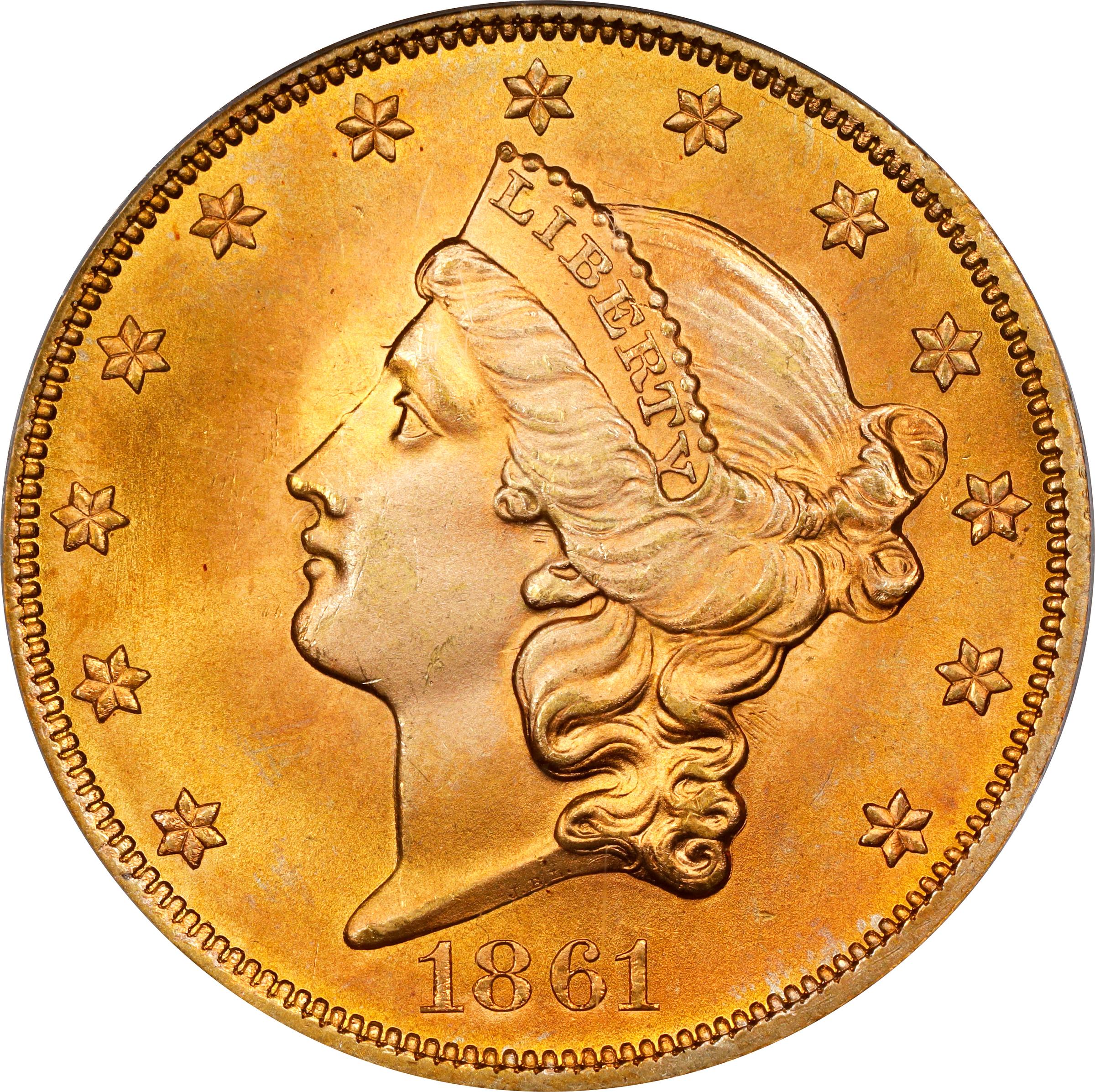 - This amazing double eagle is smartly impressed with razor sharp to full strike detail throughout the design. Beautiful surfaces are vividly colored with wisps of powder blue on dominant rose-orange. They are also highly lustrous with an intense satin finish. Remarkably well preserved without so much as a single detracting blemish, this condition rarity Gem is equally well suited for a high quality type set or advanced Liberty Head double eagle collection.<p>With 2,976,453 pieces produced, the 1861 has the highest mintage of any pre-1904 double eagle, achieved to help fund the Union war effort on the outbreak of armed conflict with the South. Prior to the salvage of shipwreck treasures such as that of the S.S. <em>Central America</em>, this was the most available issue of the Type I Liberty Head design. A string of early Union defeats on the battlefield resulted in Northern banks suspending gold specie payments in December 1861. Hoarding began, an activity that probably accounts for most of the several hundred Mint State survivors of this issue. Given the popularity of the Liberty Head double eagle series with today's advanced gold specialists, even premium Choice Uncirculated examples are rare from a market availability standpoint. At and above certified MS-65, the 1861 emerges as a landmark condition rarity and, indeed, this is the first example at this level that we have offered in more than a decade. A fleeting opportunity that is sure to result in spirited bidding among astute collectors.