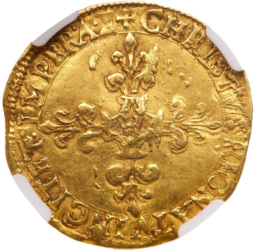 France. Ecu d'or, 1569-A (Paris).Fr-378; Dup-1057; Sb4904:NER=2. 3.31g. Charles IX, 1560-1574. Crowned Ecu of France, sun above. Reverse; Floriated cross. NGC graded AU-50.Estimated Value $500 - 600