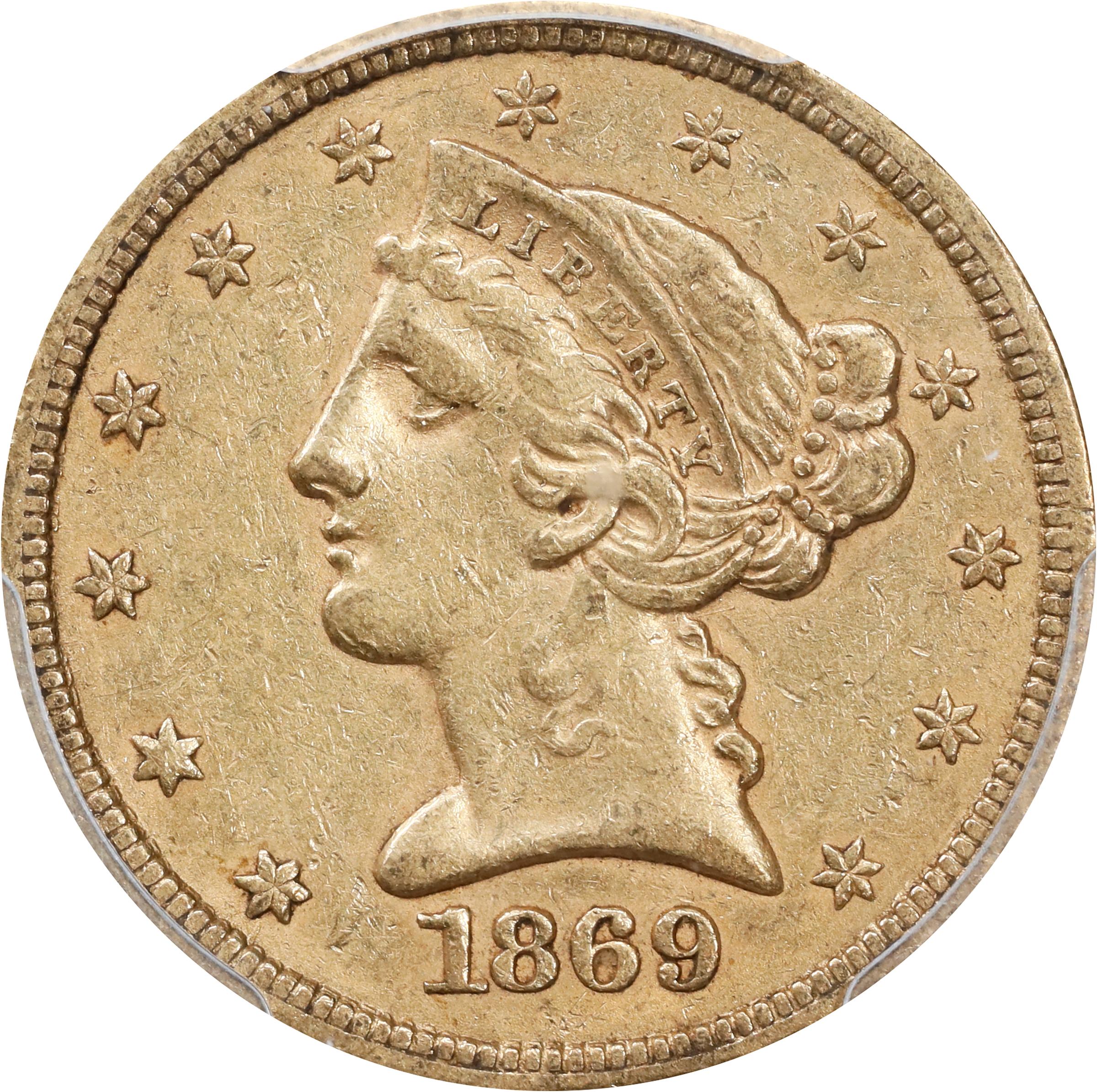 - A lustrous and vivid AU 1869-S half eagle, an issue that is elusive even in lower circulated grades. The present example saw little commercial use, in fact, and retains not only much of the satiny mint finish, but also generally sharp striking detail that comes up short at only at the central high points. This is a scarce issue that becomes rare in grades above EF. Extensive commercial use claimed most of the 31,000 half eagles struck in the San Francisco Mint during 1869, and most of the survivors are well worn if not also impaired. Mint State examples are all but unknown; this AU - rare in its right - represents the finest in quality realistically obtainable for most collectors.