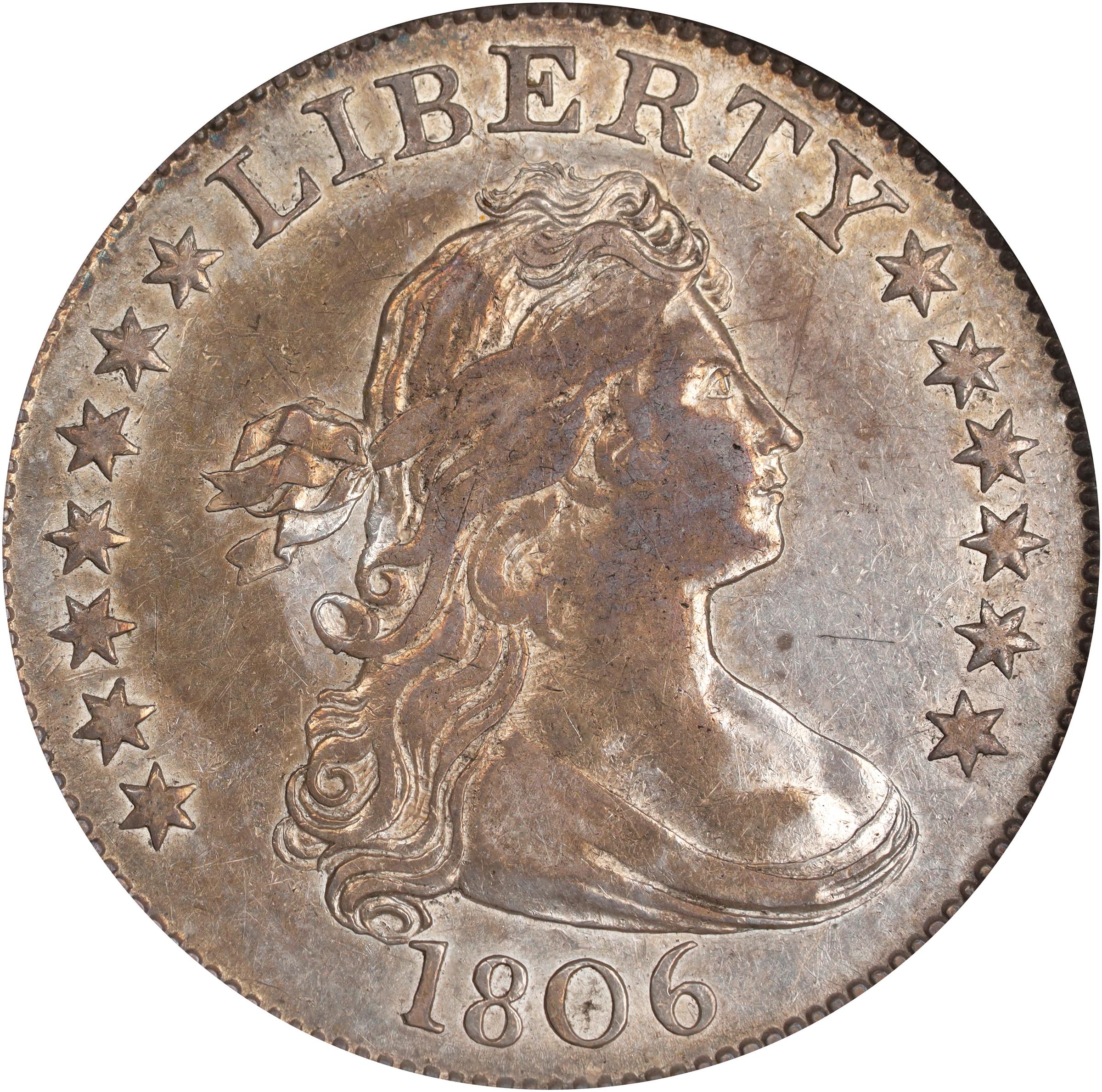 - Tompkins Die Stage 2/2, Rea et al. Die State P. Dusky silver gray surfaces with blended olive-gold that finds greatest expression in the left obverse field. Much frosty luster remains to shine forth nicely as the coin dips into a light. Lightly struck in the centers, as expected for the type, but there is only light wear, and the detail is appreciably bolder toward the borders. A touch of glossiness to the texture and a faint scratch in the upper right obverse field are noted for accuracy.<p>Representing the only use of this obverse die, and the first of two uses of this reverse die, the Browning-5 is one of the scarcer die marriages of the 1806-dated quarter issue. The NorthEast Collection specimen is tied for CC#8 in the 2010 Rea-Peterson-Karoleff-Kovach census.