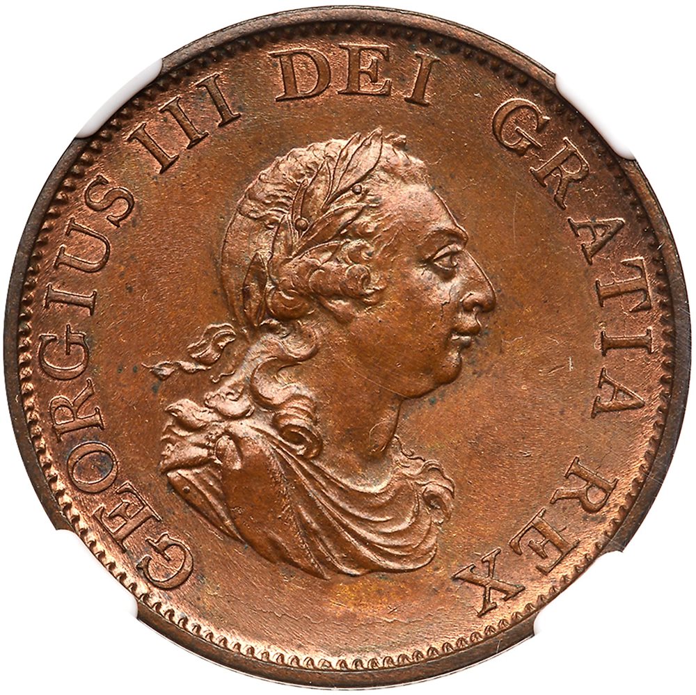 Great Britain. Halfpenny, 1799.S.3778; KM-647. 5 incuse Gun ports. George III. Obverse; Draped laureate bust of king. Reverse; Britannia. NGC graded MS-64 Brown. Estimate Value $100 - 125