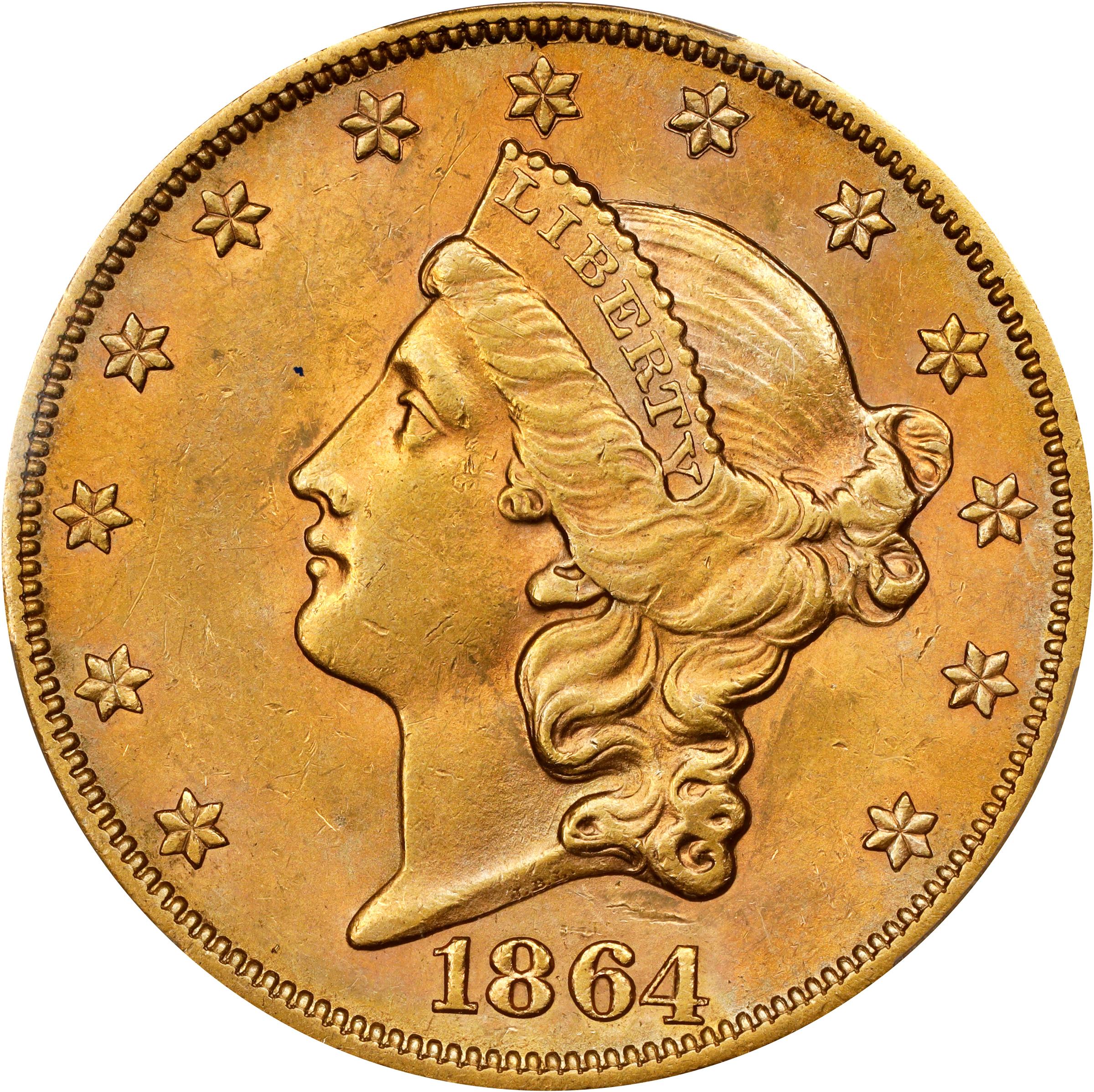 - Warmly patinated in deep honey-orange with delicate pinkish-rose overtones, this beautifully preserved example also offers softly frosted luster and overall sharp striking detail.<p>The San Francisco Mint produced 793,660 double eagles in 1864 according to government records. These circulated extensively on the Pacific Coast and it is believed that many were exported overseas. The 1864-S once ranked as a foremost rarity in Mint State; indeed, David W. Akers listed just four auction appearances of Uncirculated examples in his 1982 tome on double eagles. Since that time, additional Mint State examples have entered the market. In 1999, as a consequence of the underwater excavation of the wreck of the S.S. <em>Brother Jonathan</em>, which sank in 1865, newly discovered Mint State examples were added to the roster of known specimens, followed by more from the S.S. <em>Republic</em> treasure. It is now known that even more Mint State examples have come from other sources. Presently, the Uncirculated population is estimated at 220 to 240 coins, a total that is still limited when compared to the strong demand that Mint State double eagles enjoy in today's market. For the assigned grade, this is one of the nicest examples of the issue that we have handled in recent sales, and it is worthy of the strongest bids.
