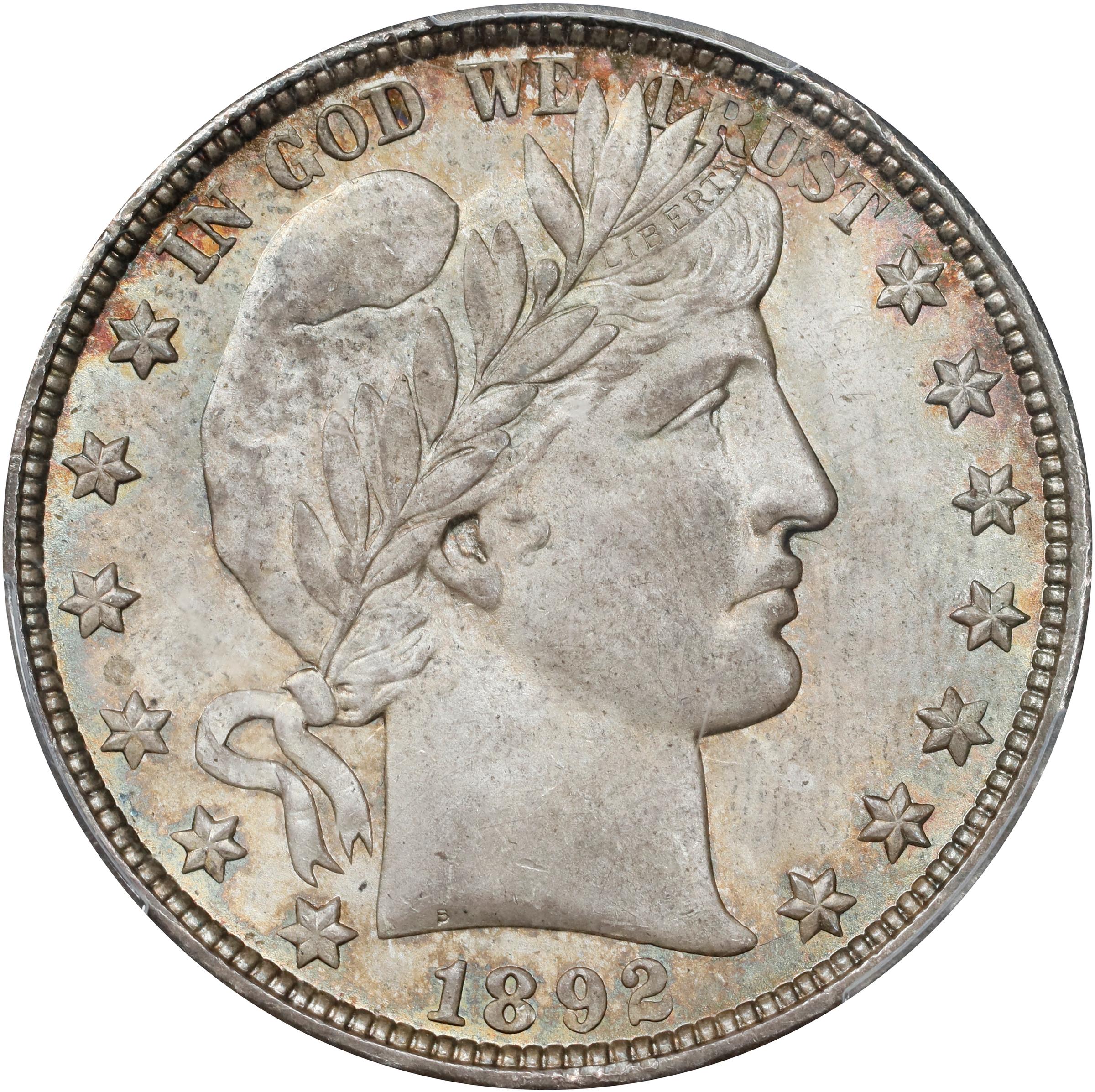 - A premium Gem example of the inaugural Barber half dollar issue from the New Orleans Mint. A glowing satiny frost highlights amber, rose, lilac-gray, and antique silver patina. Well struck overall with just the slightest trace of weakness at the highest points. There are no distracting marks of any kind even under intense scrutiny with a strong glass. Traces of an ancient fingerprint on the obverse further attest to the absolute originality of this impressive piece, among the finest certified from a mintage of 390,000.