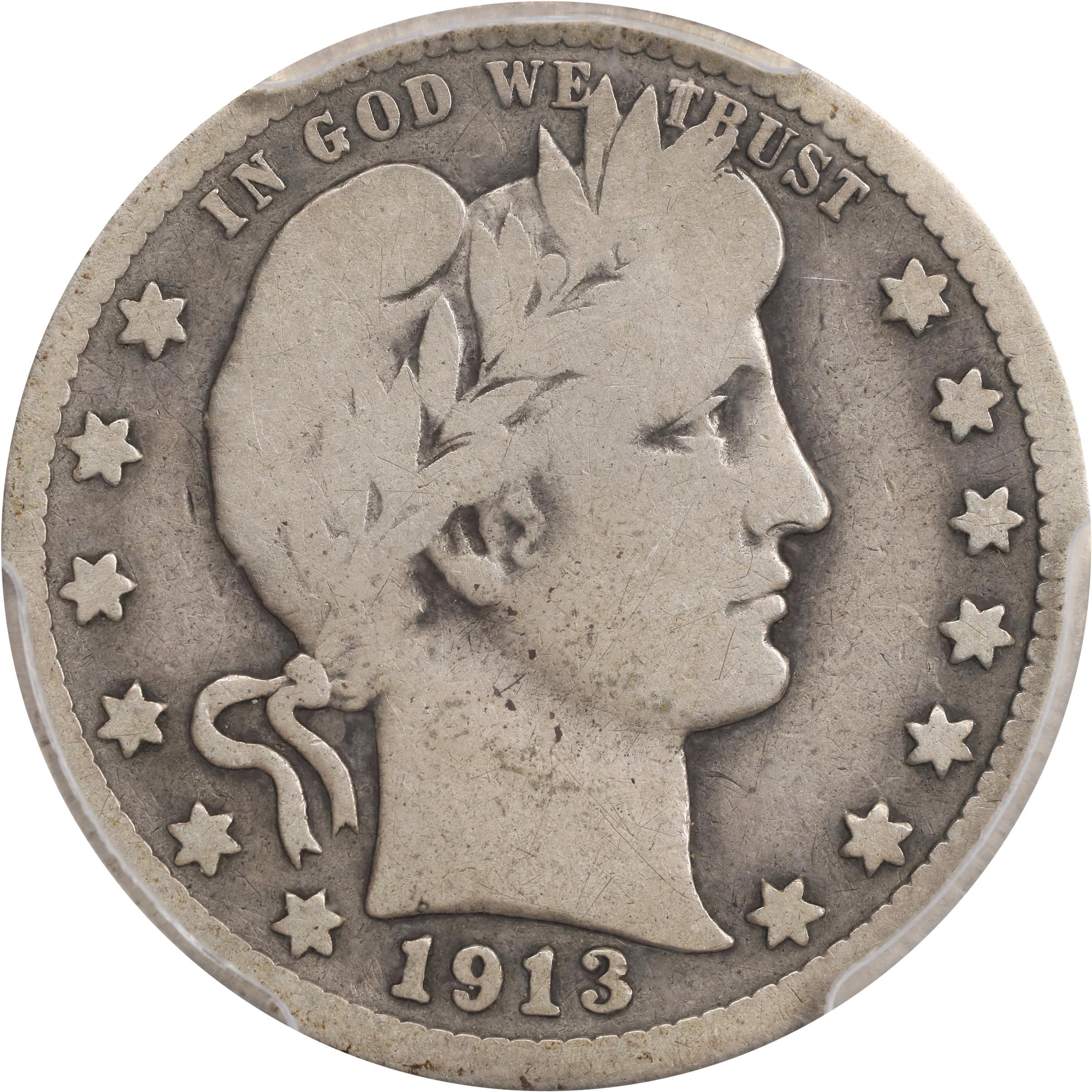 - Impressively smooth for the assigned grade, the surfaces are warmly toned in pewter and steel gray with some semblance of circulated cameo contrast between the fields and devices. The rims are distinct from the peripheral motifs, and some bolder detail remains within the deepest recesses of Liberty's portrait and the eagle. One of the "big three" among key date Barber quarters, the 1913-S has a paltry mintage of 40,000 pieces.