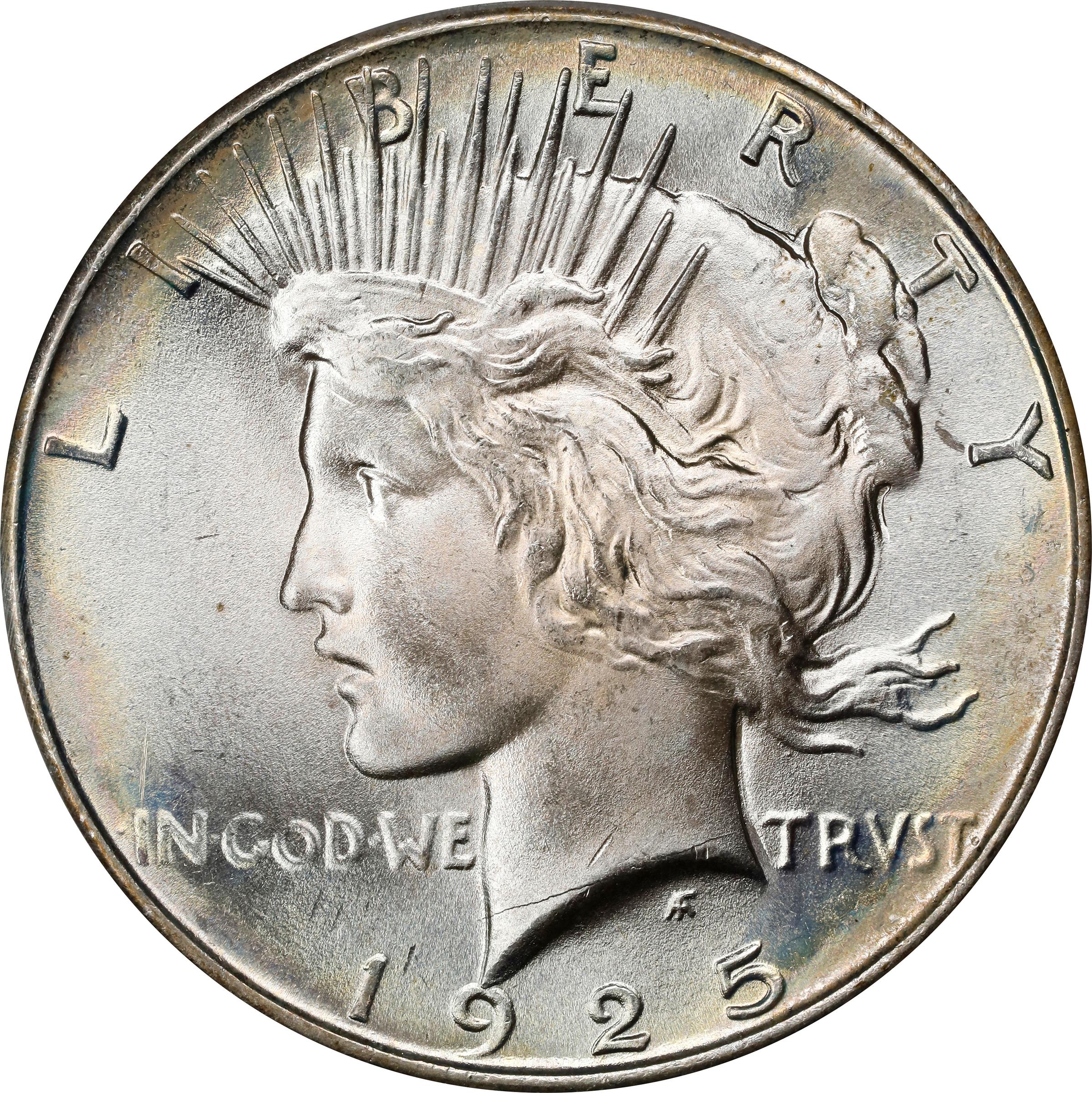 - This is a lovely and conditionally rare example of what many collectors consider to be the most beautiful design ever used on a regular issue U.S. Mint silver dollar. Fully struck with billowy satin to softly frosted luster, both sides are further enhanced by warm, vivid peripheral toning in sandy-gold and pale apricot. Remarkably well preserved for a Peace dollar of any issue, and supremely attractive in all regards. The Peace dollar as a type is much rarer than its Morgan dollar predecessor of 1878 to 1921 in Superb Gem Uncirculated. Not only were far fewer Peace dollars produced, but poor striking quality, inferior luster and/or heavily abraded surfaces confine most Mint State survivors to lower grades through MS-65. Here, then, is a significant piece for the quality conscious bidder - a coin that would make an impressive addition to a high grade type set or specialized Peace dollar collection.