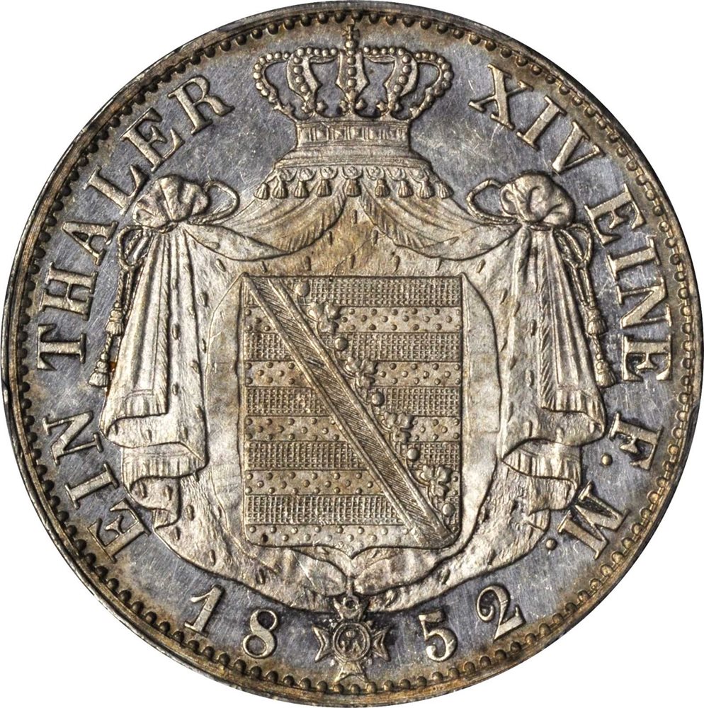 - GERMANY. Saxony. Taler, 1852-F. PCGS MS-62 Secure Holder.