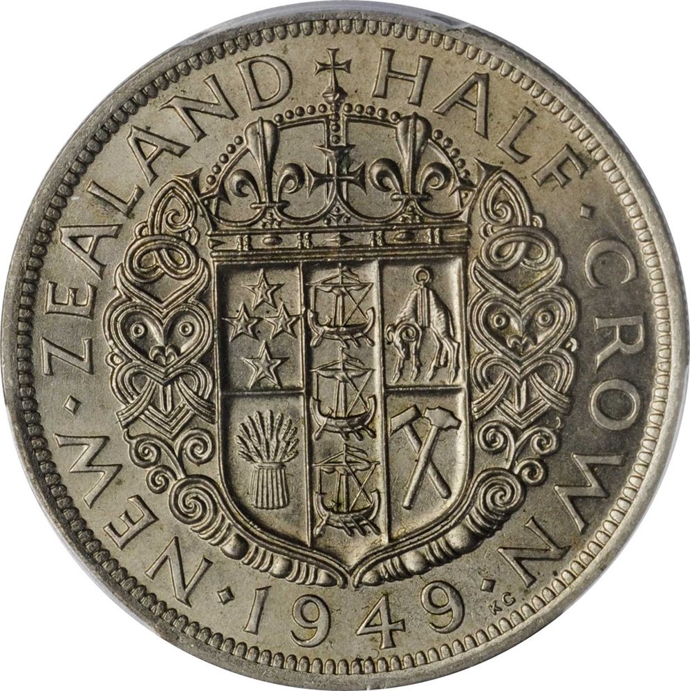 - NEW ZEALAND. 1/2 Crown, 1949. PCGS MS-65 Gold Shield.