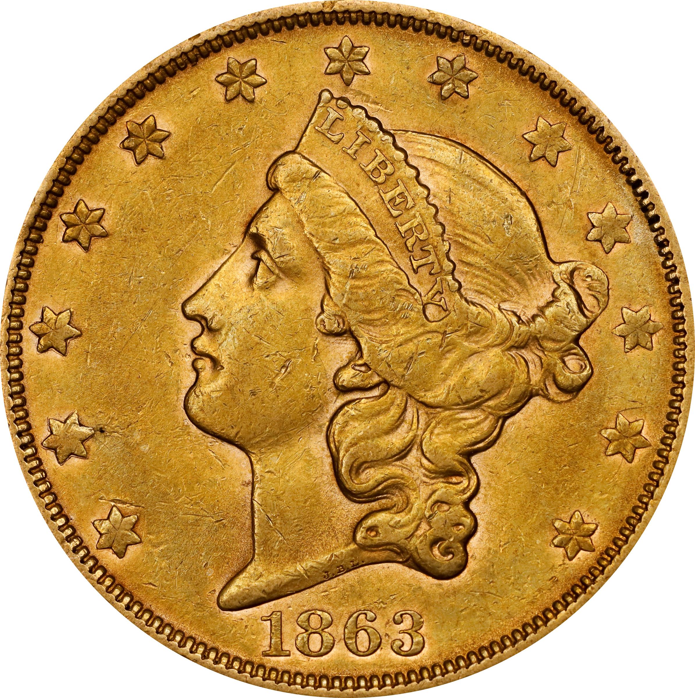 - Warm medium golden-honey surfaces are lustrous for the grade with plenty of bold detail enhancing the focal design elements in the centers. The mintage for the 1863-S double eagle is 966,570 pieces, a substantial production figure for the Civil War era. This issue circulated extensively in West Coast commerce at a time when specie had virtually disappeared from day-to-day transactions in the Midwest and the East. Although many were likely exported overseas in later years, survival rates are comparable to most other double eagle issues from the early to mid 1860s. A visually appealing AU example such as this provides access to this historic issue for many collectors.