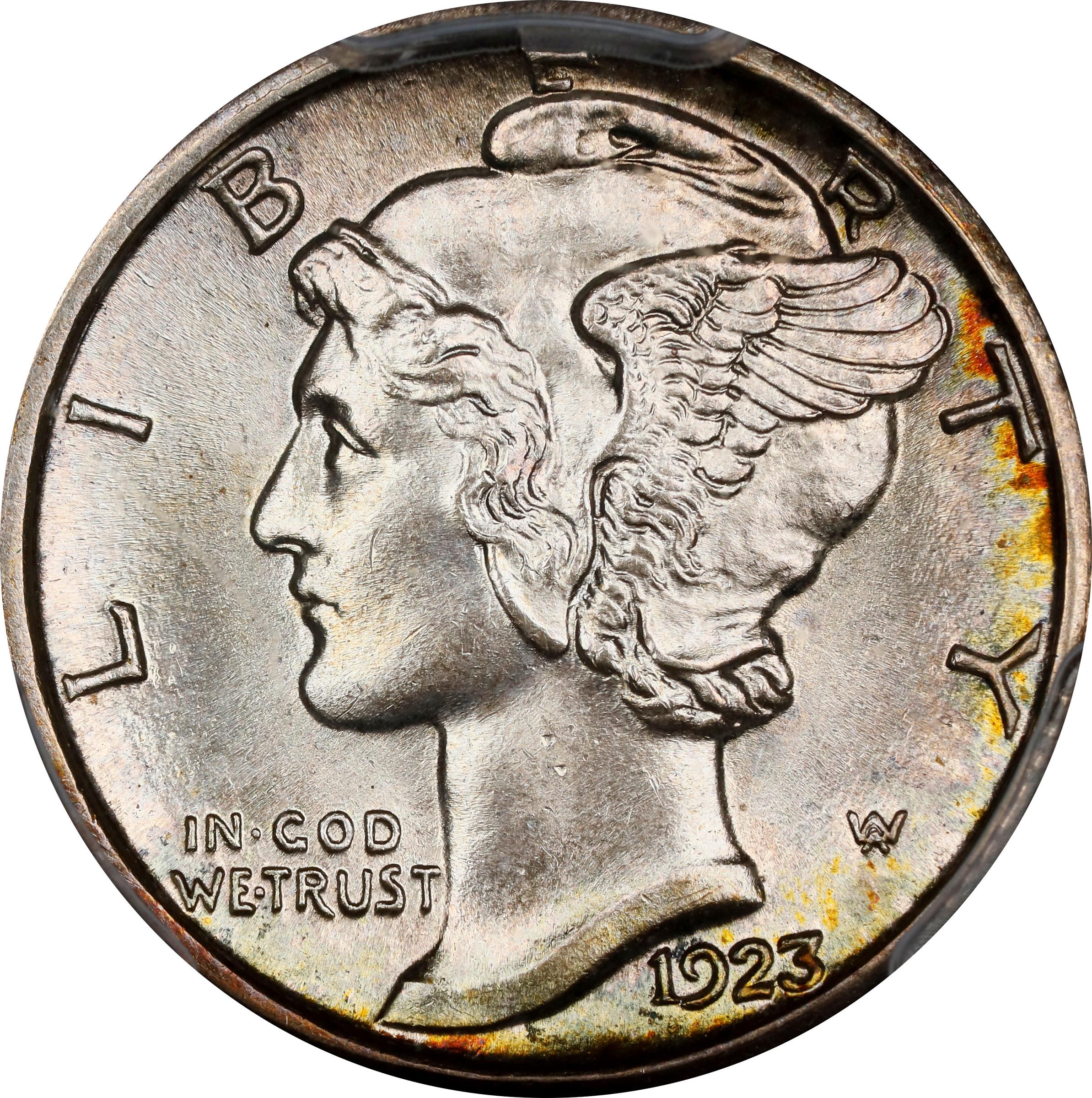 - An outstanding coin to represent this conditionally challenged San Francisco Mint issue. Pretty champagne-gold iridescence engages the reverse, as well as the obverse periphery. Satiny mint luster throughout with a sharply executed strike and exceptionally well preserved surfaces. <p>Typical of most early date Mercury dime issues, especially those from the San Francisco Mint, the 1923-S (6,440,000 pieces produced) is common only in the lowest circulated grades, the result of widespread hoarding during the 1940s and 1950s. It is scarce in VF, EF and AU, and very rare in fully struck Gem Mint State. Writing in his excellent 2005 reference <em>The Complete Guide to Mercury Dimes</em>, David W. Lange ably introduces the 1923-S with the comments:<p><em>In estimating the rarity of this issue with full bands, it may be instructional to quote from two detailed analyzes of the Mercury Dime series published by </em>The Coin Dealer Newsletter Monthly Summary<em> in 1977 and 1980, respectively. In March 1977, the late Allen Harriman had this to say: "This issue appears in the top twelve or fourteen 'most elusive with full bands' list of several major dealers. The 23-S is rather easy to find in any grade thru average strike MS-65 - and 'sliders' are relatively common." Three years later, Rick Sear did a follow-up study: "For years this was an underrated date - but no longer. Still, it is a difficult issue to find well struck; both flat bands and fadeaways are often seen."</em><p>This is one of only two examples certified finer than MS-65 FB that we have offered in at least 15 years, which confirms that the 1923-S has retained its reputation as a leading strike and condition rarity in this series over the last half century. A stunning premium Gem worthy of inclusion in the finest Mercury dime set.